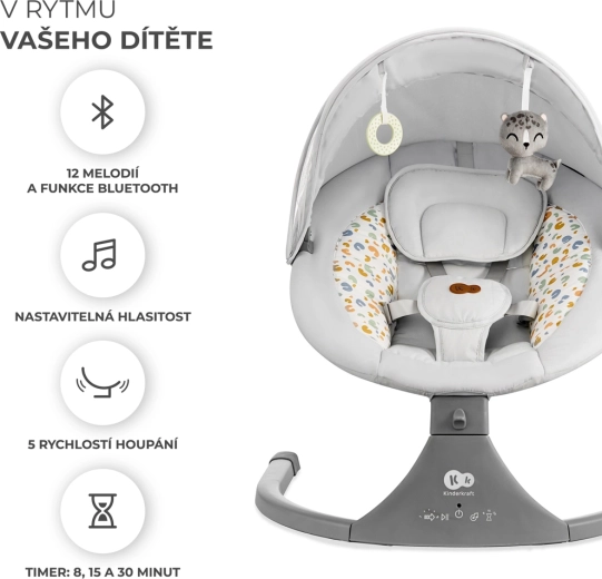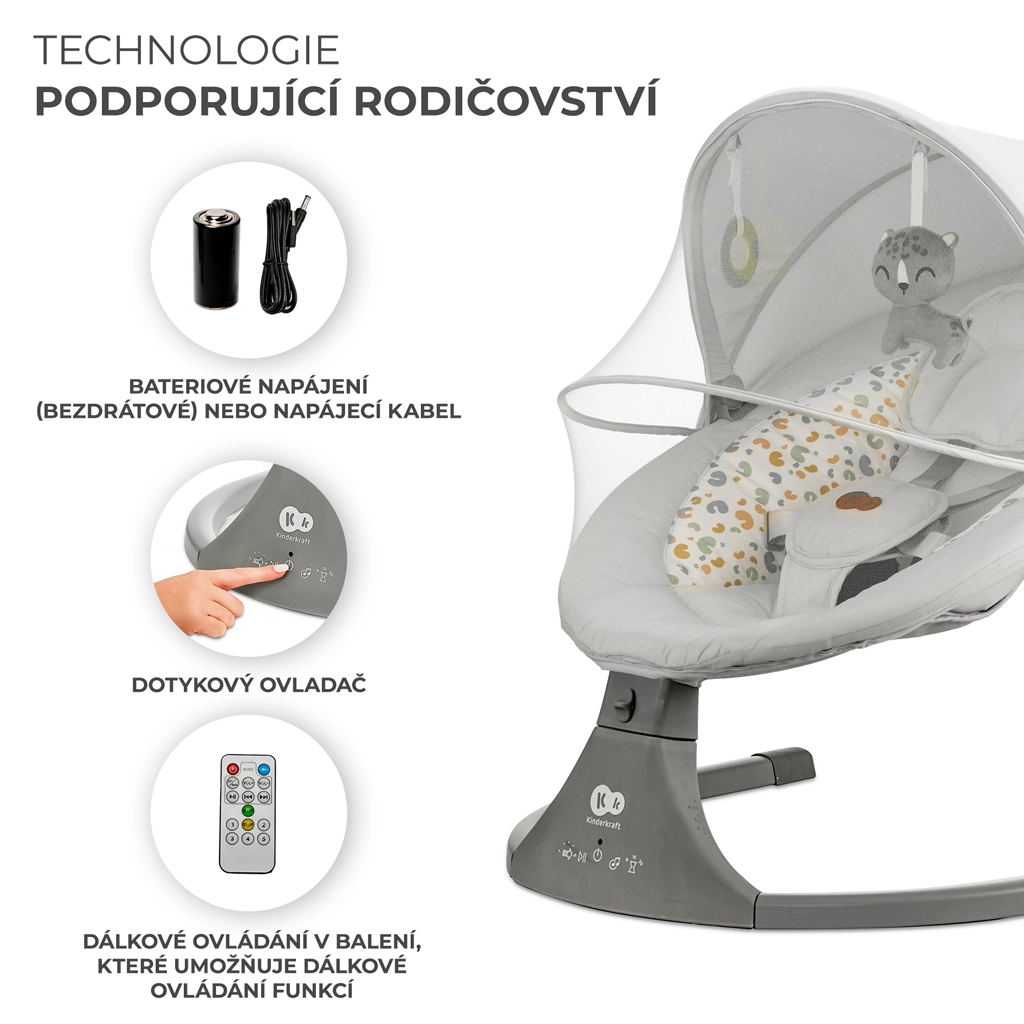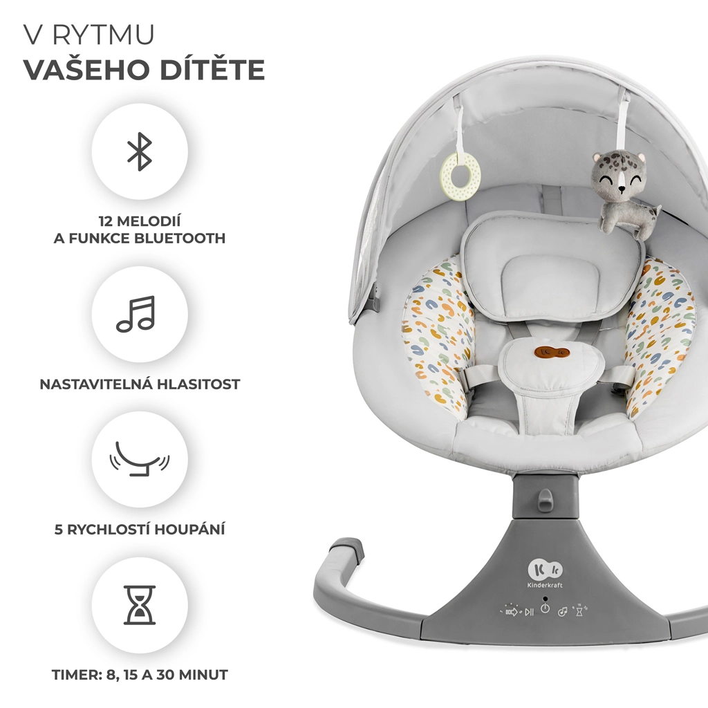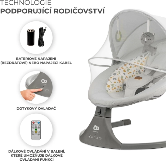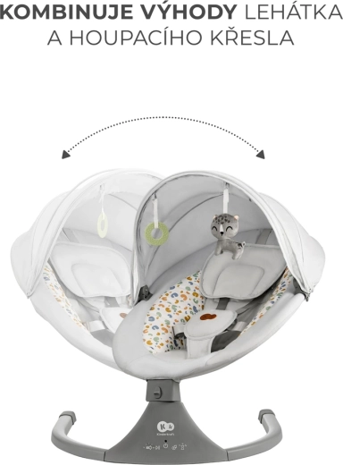 Ležalnik Kinderkraft LUMI združuje sodobno tehnologijo in varen dizajn za udobno uspavanje od rojstva do 9 kg. Zaradi bočnega zibanja se dojenček počuti kot v naročju, medtem ko tih motorček ne moti spanca. Z mobilno povezljivostjo Bluetooth in vhodom USB zlahka predvajate najljubše uspavanke neposredno s telefona.