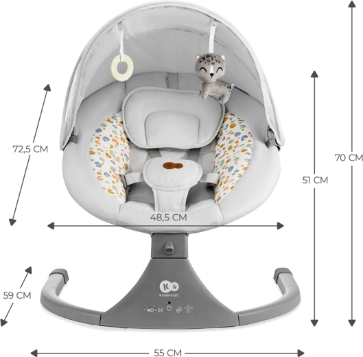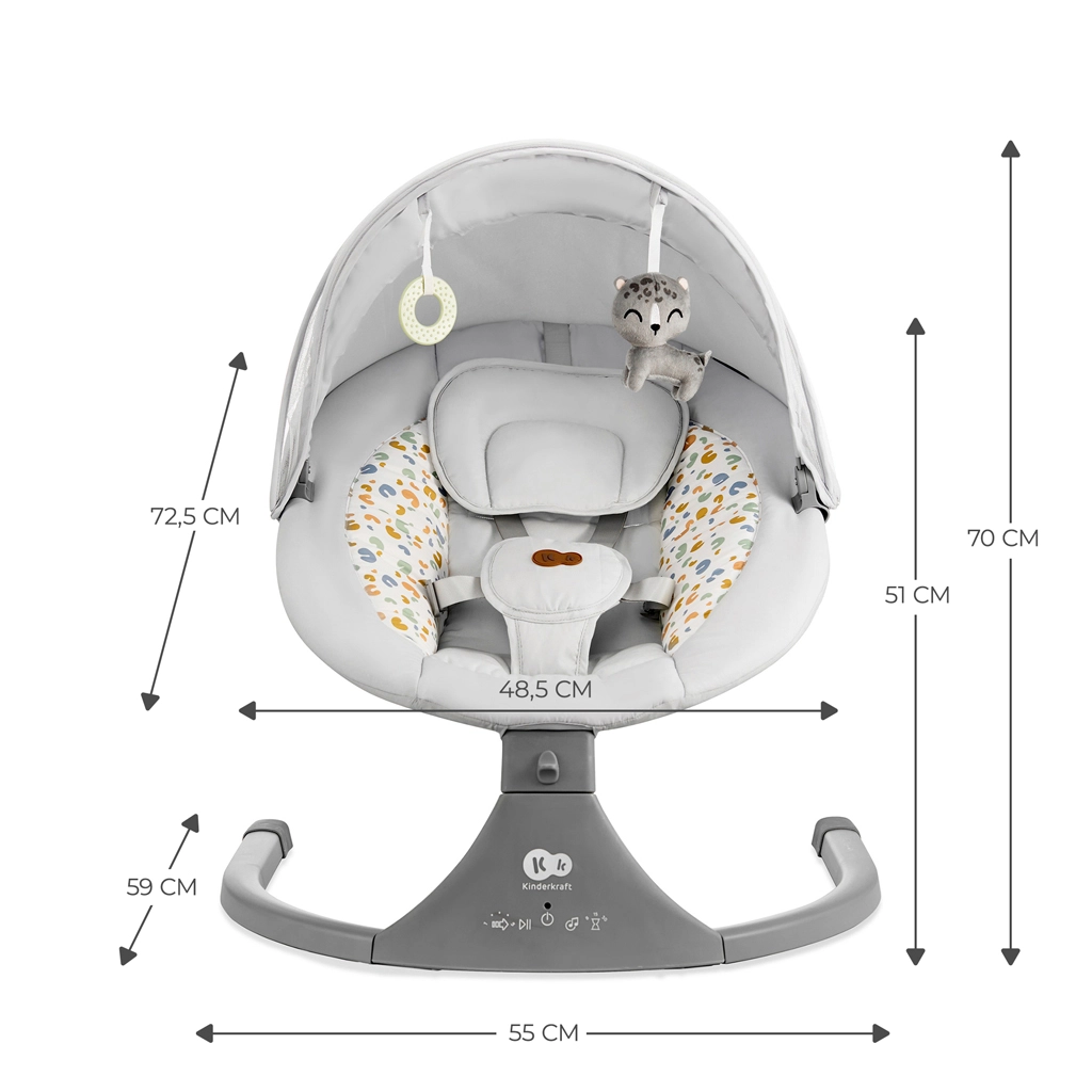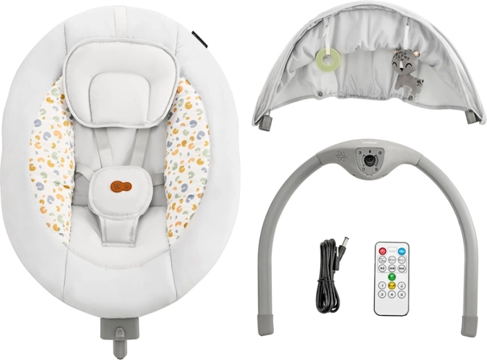 - Enostavno upravljanje: 5 hitrosti zibanja, 12 melodij, nastavitev glasnosti, časovnik in daljinski upravljalnik.