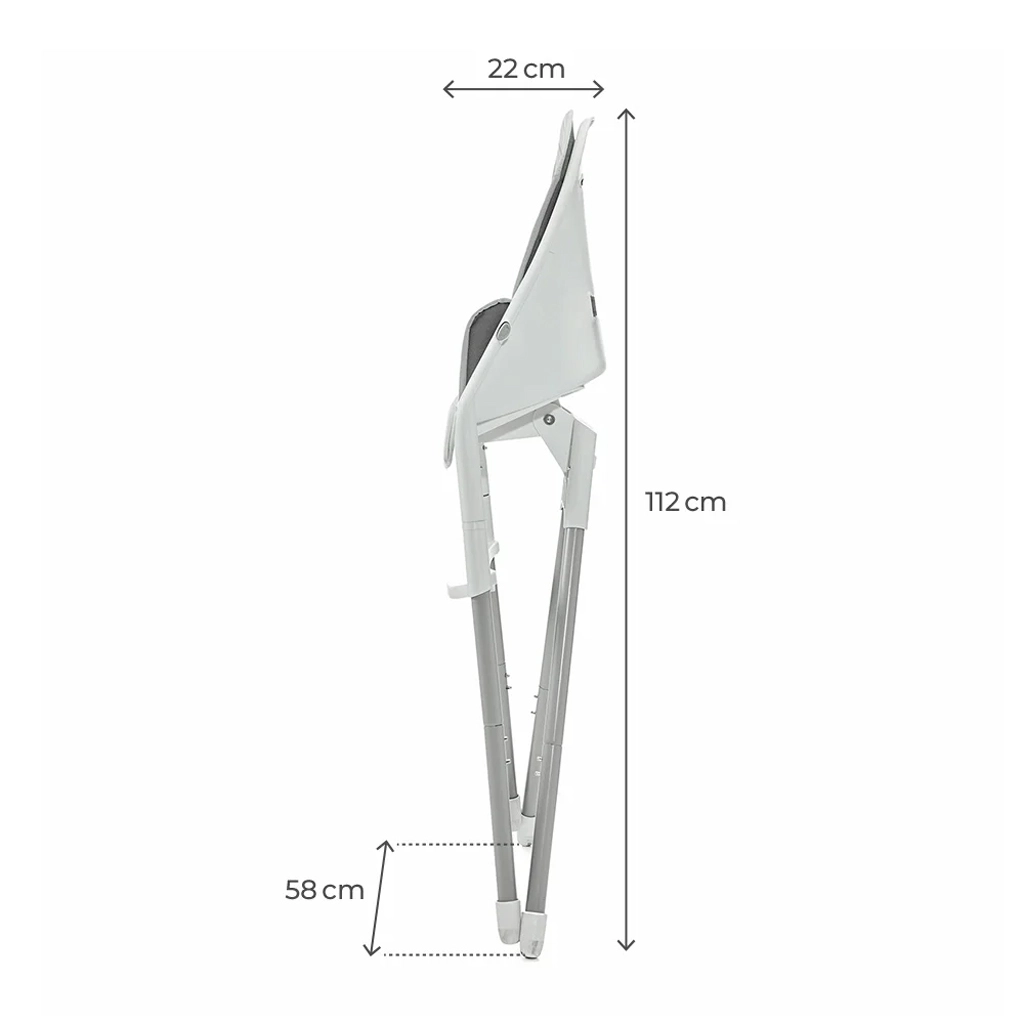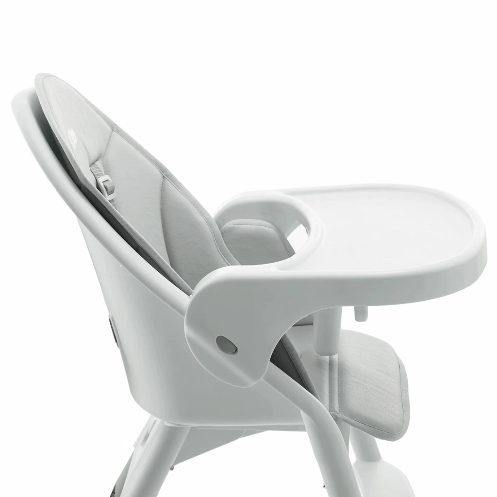 Jeklen okvir, 5-točkovni pasovi in protidrsne nogice zagotavljajo visoko stabilnost in varnost pri vsakem obroku. Pladenj deluje tudi kot zaščitni odbijač.