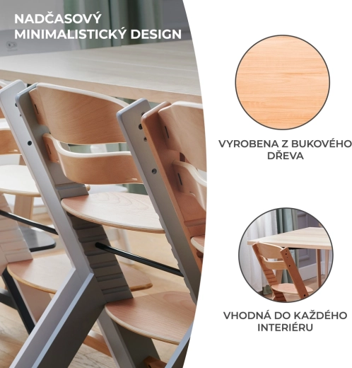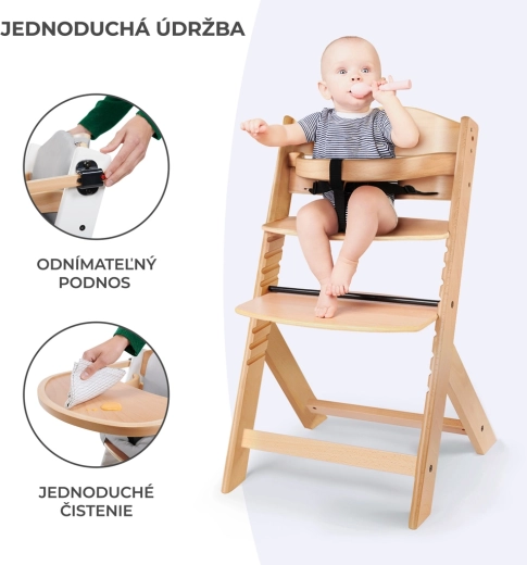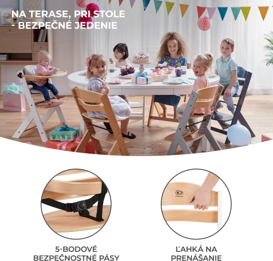Za najmlajše je na voljo širok snemljiv pladenj in tritočkovni pas, za starejše otroke pa varnostna ograja. Stolček se zlahka čisti, njegova lahka konstrukcija pa omogoča udobno prenašanje med kuhinjo, jedilnico in teraso. Minimalistična zasnova se odlično poda v skandinavske, klasične in moderne interierje.