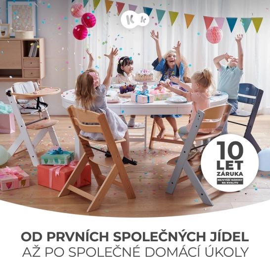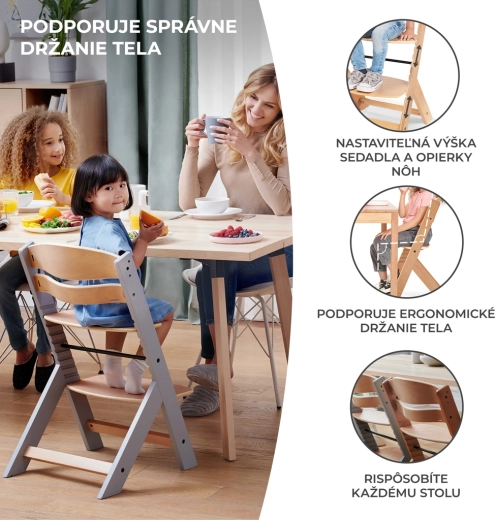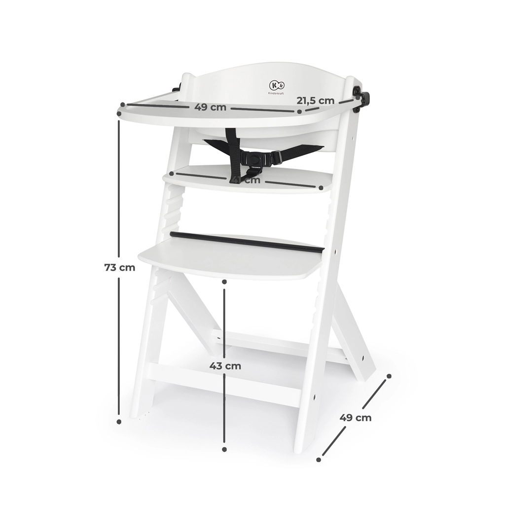 Kinderkraft Enock je brezčasen visok stolček, ki ga zlahka spremenite v ergonomski stol za starejšega otroka. Zahvaljujoč petstopenjskemu nastavljanju naslonjala, nastavljivi opori za noge in širokemu sedišču se odlično prilagodi starosti in višini otroka. Masivni bukov les in kakovosten vezan les zagotavljata izjemno stabilnost in dolgo življenjsko dobo.