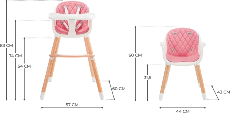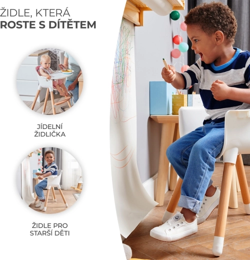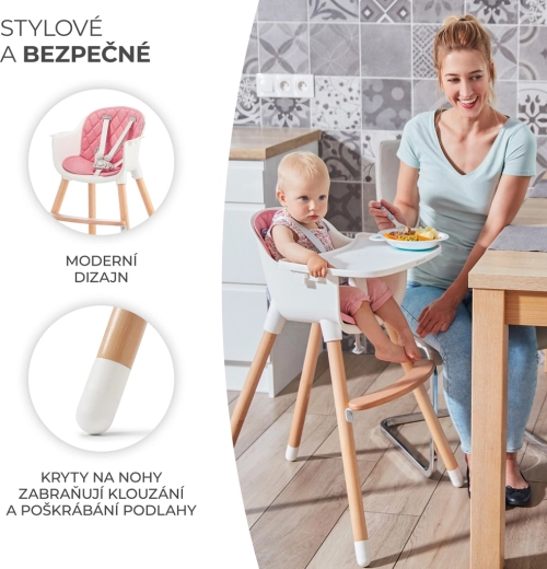 Praktičen in stilski jedilni stol 2v1, ki raste z vašim otrokom – visok stol za hranjenje in nižji stol za starejše otroke (do 20 kg). Enostavno čiščenje zahvaljujoč odstranljivemu pladnju in plastičnemu sedežu, ponuja udobno oporo za noge, varnost zagotavljajo 5-točkovni pasovi in nedrseči nastavki na nogah.