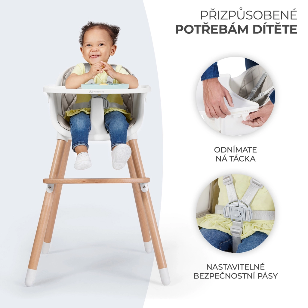 KINDERKRAFT Sienna je vsestranski jedilni stol, ki se hitro prilagodi potrebam vaše družine. Visok položaj je idealen za prve kašice in skupne obroke, nizka različica pa odlično služi starejšim otrokom pri dejavnostih in obedovanju. Zaradi vzdržljive konstrukcije, enostavnega rokovanja in preprostega vzdrževanja je rešitev za dolga leta.