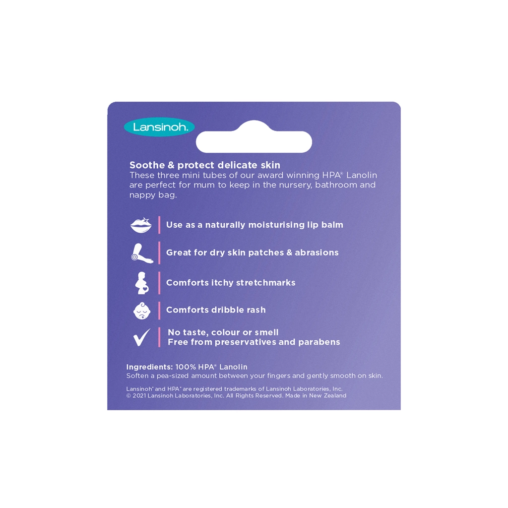 Lansinoh HPA lanolinska krema Minis prinaša preverjeno nego bradavic doječih mamic v priročnih tubicah 3×7 ml. Zagotavlja takojšnje olajšanje, podpira vlažno celjenje ran brez nastanka krast in ščiti kožo pred nadaljnjim draženjem. Je 100% naravna, hipoalergena in potrjena s strani Britanske fundacije za alergije, zato je varna za mamico in dojenčka.