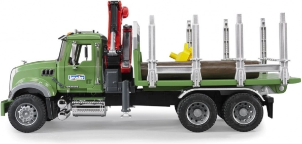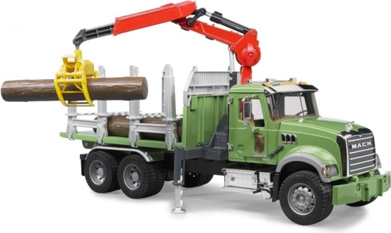 Robusten model tovornega vozila BRUDER MACK GRANITE je idealen za realistično igro sečnje in prevoza lesa. Prosojna vetrobranska šipa iz nelomljivega polikarbonata, odpirajoča se kabina in pokrov motorja z vpogledom na motor dajejo modelu avtentičen videz. Stabilnost pri nakladanju zagotavljajo izvlečne oporne noge, vrtljivi žerjav s prijemalom pa je enostaven za upravljanje.