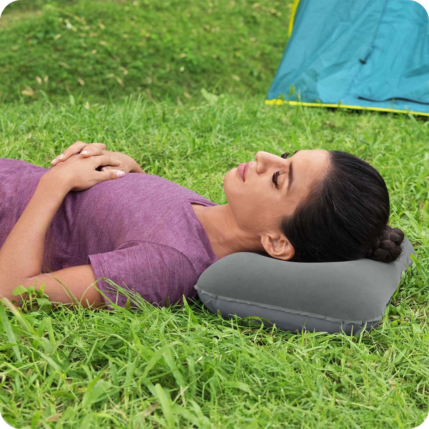 Vzglavnik zlahka napihnete in izpustite zrak, po zlaganju pa zavzame minimum prostora – spravite ga v žep nahrbtnika. Odličen za šotor, vlak in letalo.