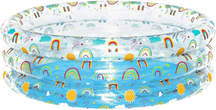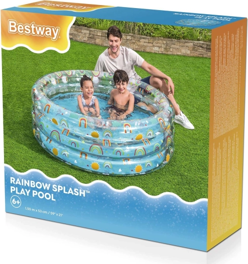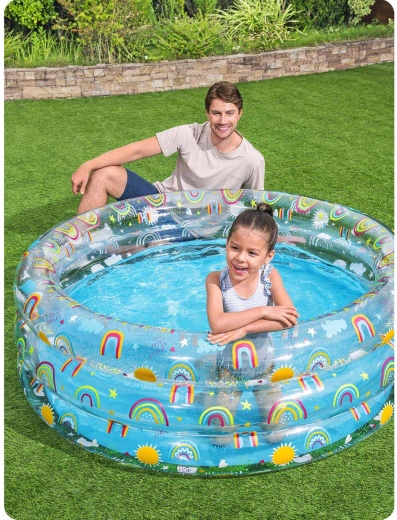 Napenljiv bazen Bestway z igrivimi motivi mavrice je odlična izbira za zunanje vodne dogodivščine otrok od 6. leta dalje. Trpežen PVC material in trije samostojni napenljivi obroči zagotavljajo stabilnost in udobje med igro. Z globino, prijetno za otroke, ponuja varno in zabavno osvežitev na vrtu.