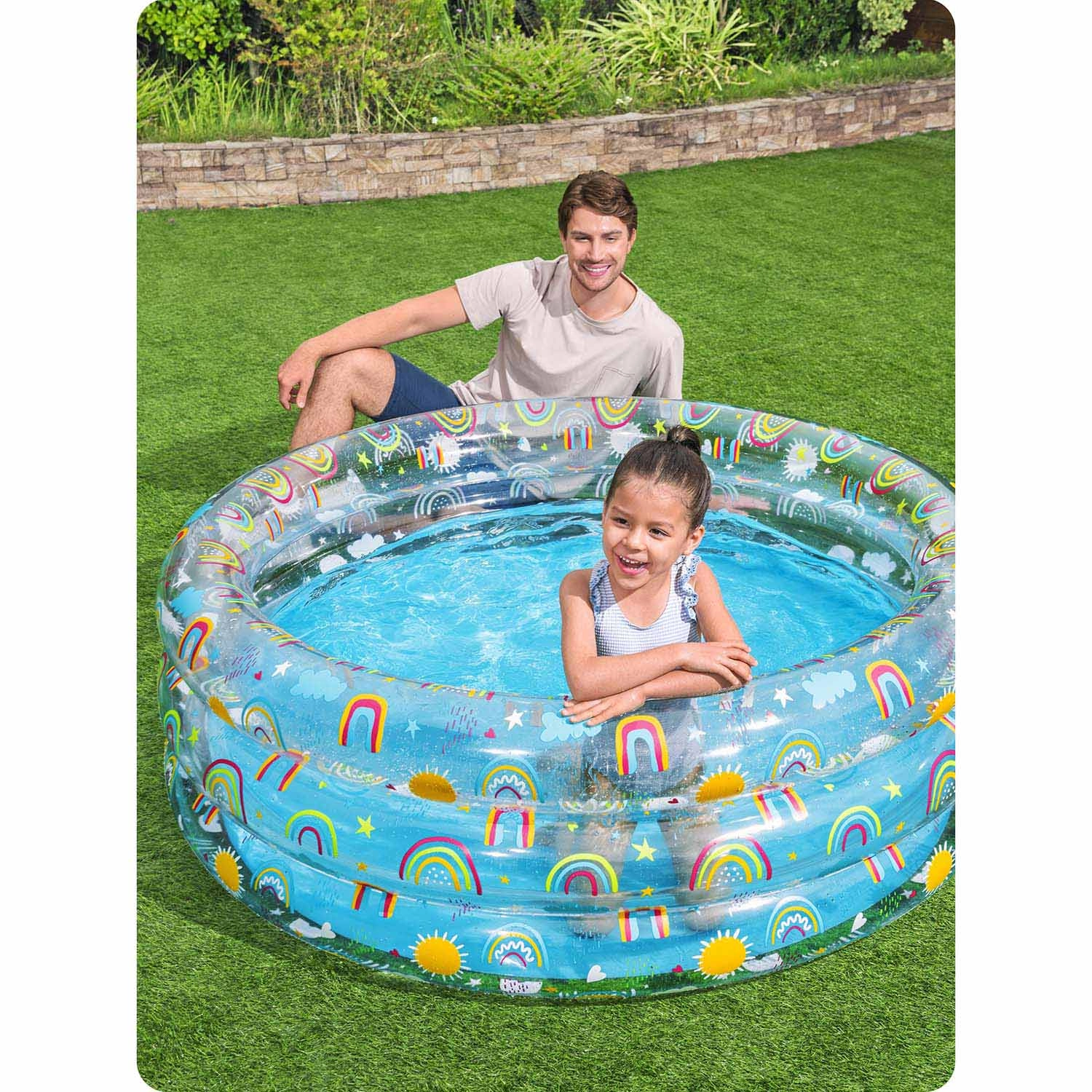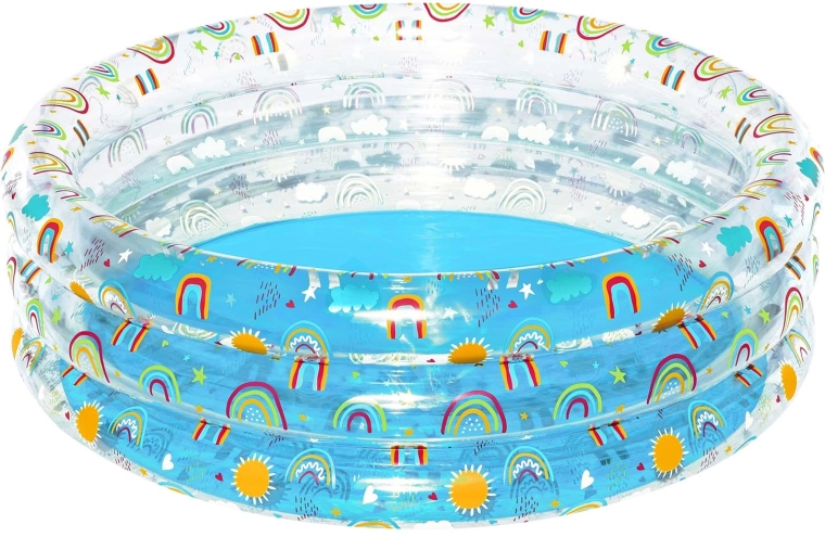 Prosojne stranice z motivi mavrice, sonca in oblačkov ustvarjajo privlačno okolje za poletne vodne radosti.