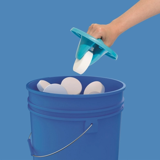 Nastavljiv dozirni obroč vam omogoča natančno nastavitev pretoka in s tem hitrosti raztapljanja tablet. Gumijast ročaj v pokrovu zagotavlja udobno in varno vstavljanje tablet brez neposrednega stika s kemijo. Dvostopenjska varnostna zapora pokrova pomaga preprečiti nenamerno odpiranje, na primer s strani otrok.