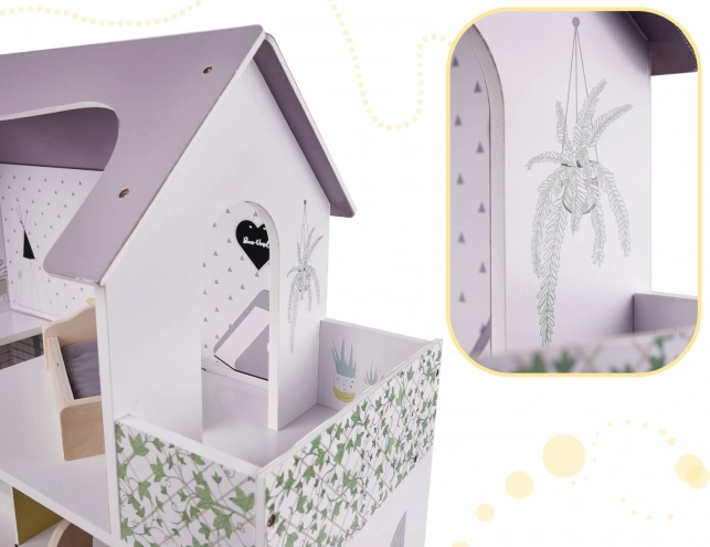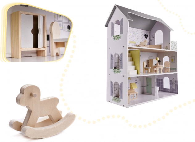 Odkrijte čar lesene hiške za punčke, ki bo postala središče pozornosti vsake otroške igre. Hiška ima tri nadstropja in je opremljena s stilskim lesnim pohištvom, ki vsakemu prostoru doda edinstven videz. Izberite si med vrtom, kuhinjo, spalnico in dnevnim prostorom, ki so popolnoma zasnovani za igranje s punčkami.