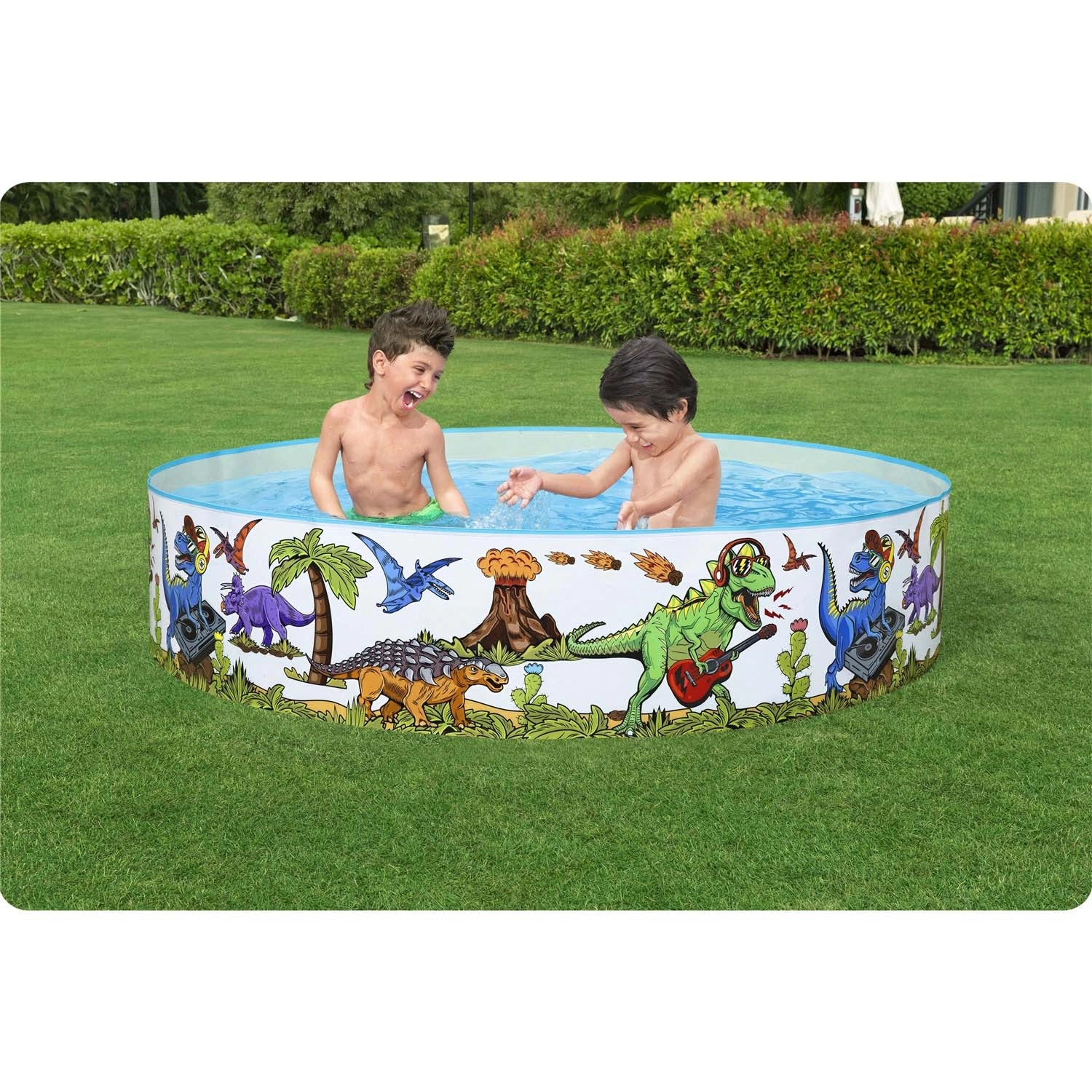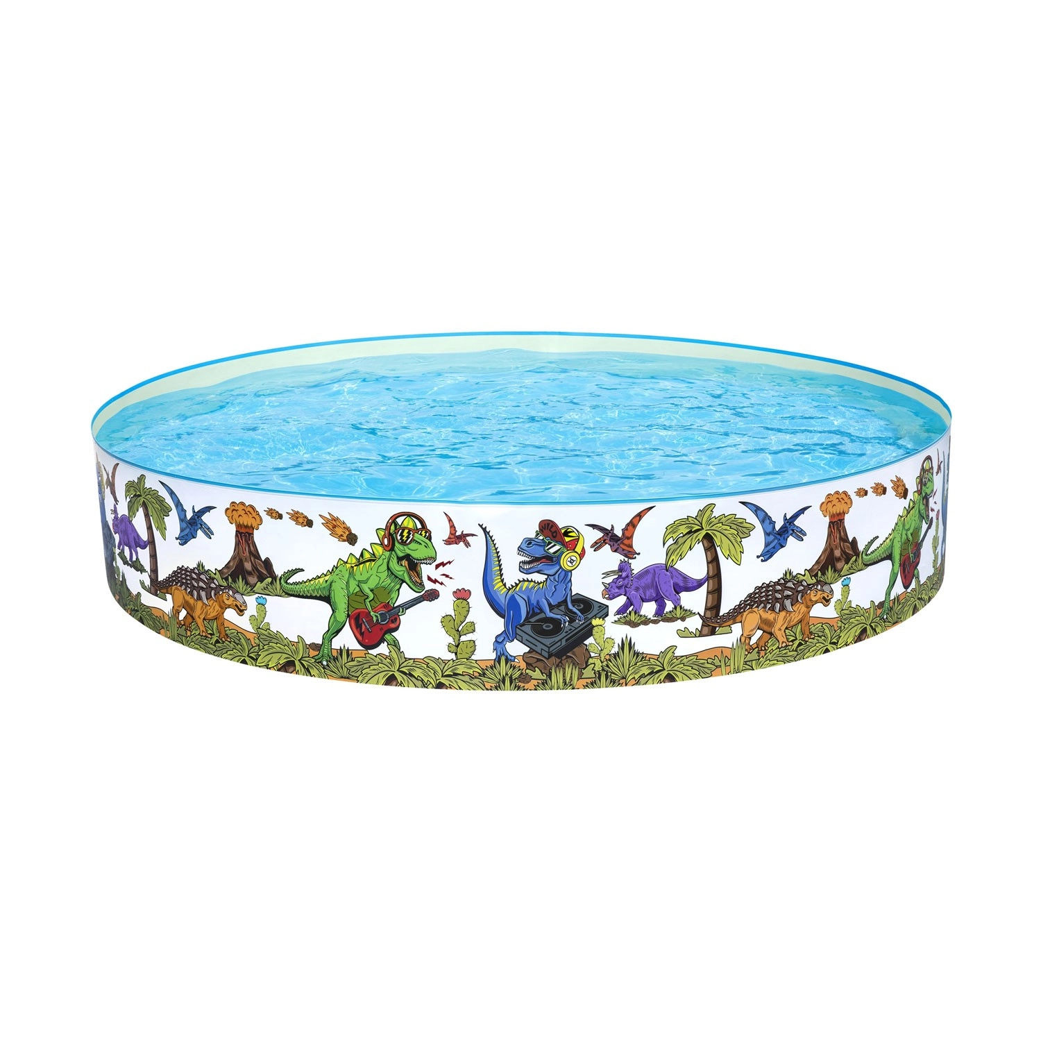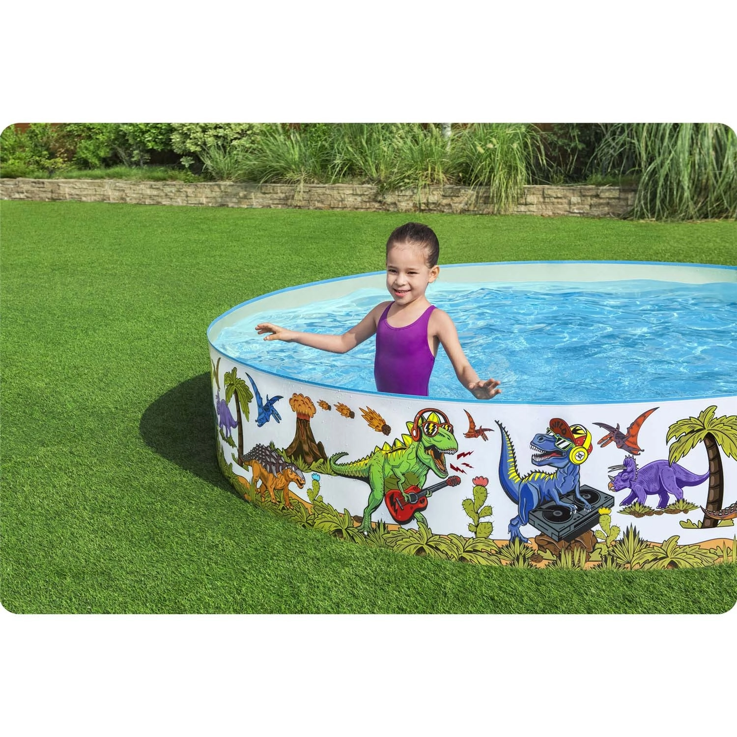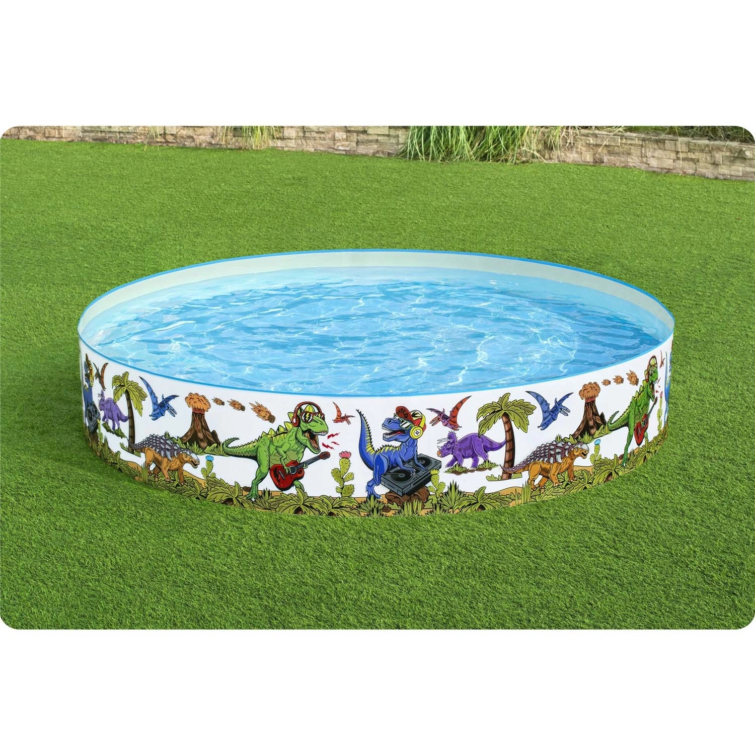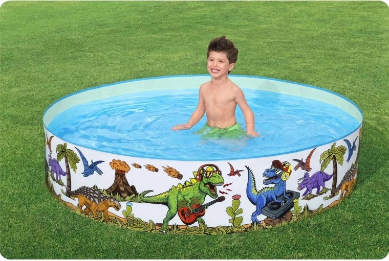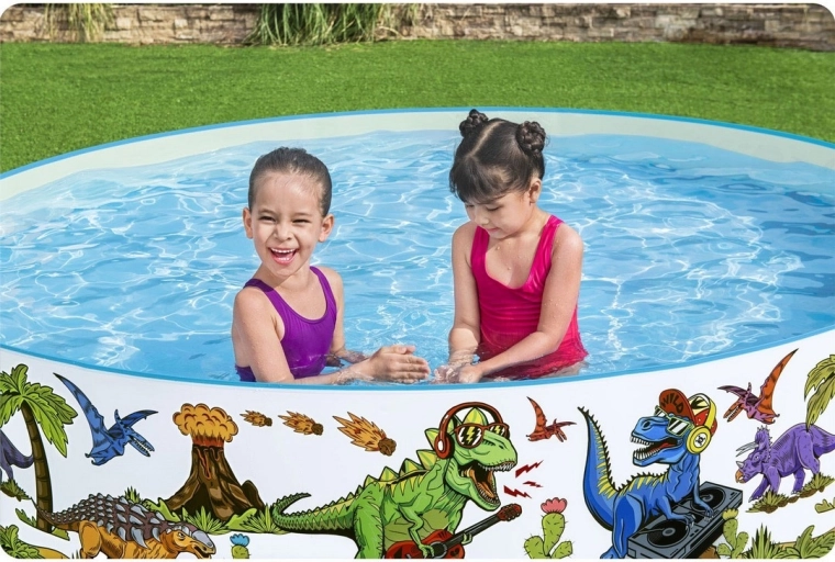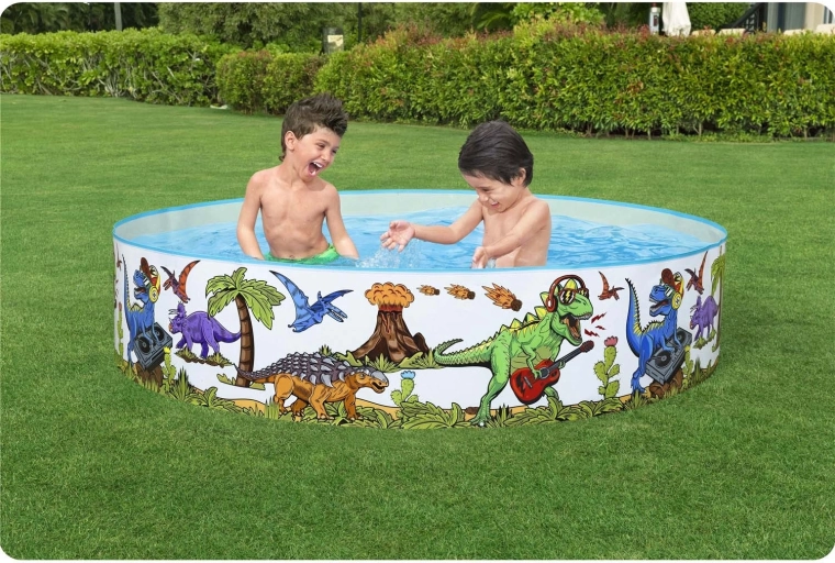 Barvite ilustracije dinozavrov po celotnem obodu spremenijo vaš vrt v cono veselja ter spodbujajo otroke k gibanju in vodnim vragolijam.