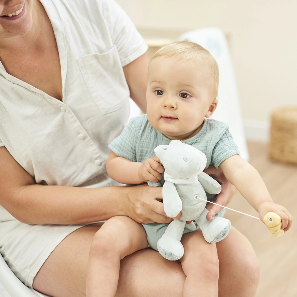 Z vlečenjem za vrvico zazveni nežna uspavanka La‑Le‑Lu, ki dojenčka pomiri in mu pomaga lažje zaspati.