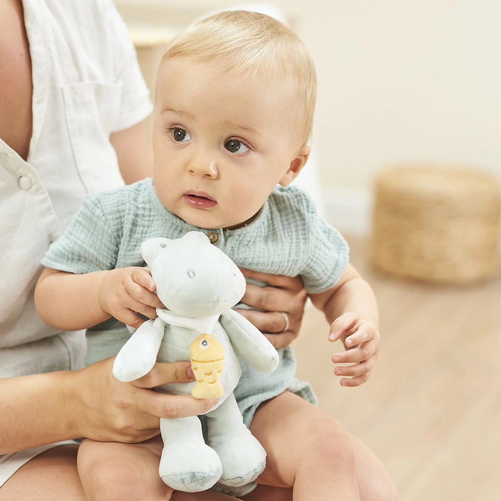 Glasbeni plišasti krokodil NATTOU Romeo je nežen prijatelj v posteljici in na poti. Mehkužni materiali in skrbni šivi zagotavljajo varno crkljanje, medtem ko nežna melodija La‑Le‑Lu pomaga pričarati mir in ugodje pred spanjem. Zaradi premišljenih elementov za prijem igračo zlahka držijo tudi majhne ročice.