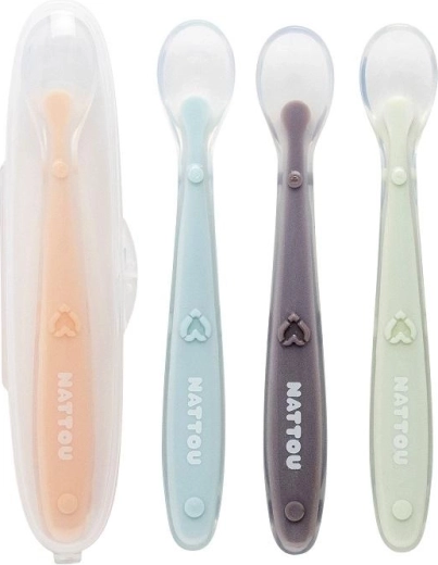 Praktičen set štirih otroških žličk NATTOU za udobno hranjenje dojenčkov in malčkov. Zahvaljujoč izjemno mehki in prožni silikonski konici so nežne do občutljivih dlesni, ergonomski ročaji olajšajo oprijem, vzdržljiv 100 % silikon brez BPA pa zagotavlja varno uporabo doma in na poti.