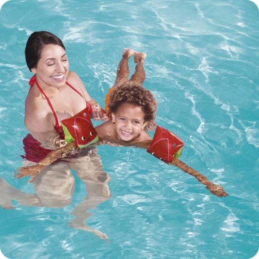 Veseli otroški rokavčki BESTWAY z motivi sadja pomagajo malim plavalcem, da se v vodi počutijo bolj samozavestno. Zahvaljujoč dvema zračnima komorama zagotavljajo stabilen vzgon, živahne barve in prikupni potiski pa povečujejo vidnost in privlačnost. Primerno za otroke 3–6 let in težo 18–30 kg.