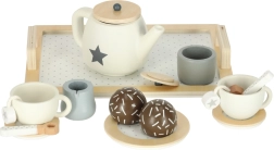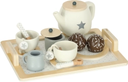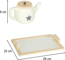 Eleganten leseni čajni set v nevtralnih barvah z zvezdniškimi detajli je idealen za otroške čajne zabave. Otroci lahko postrežejo čaj, mleko in »sladico«, vadijo vljudnost in komunikacijo ter hkrati razvijajo domišljijo.