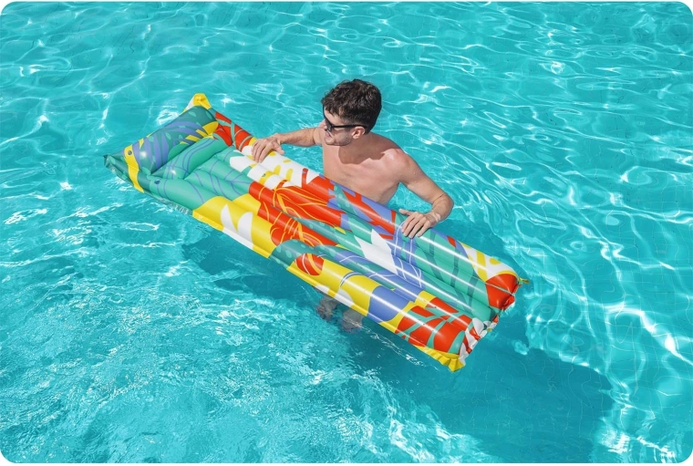 Napihljivo ležalo BESTWAY je odlično za poletni počitek in zabavo. Zahvaljujoč lahki in trpežni PVC konstrukciji se enostavno prenaša, hitro napihne in nudi udobno ležanje z oporo za glavo. Izrazit tropski dizajn navduši na prvi pogled in doda vašemu vodnemu oddihu stil.
