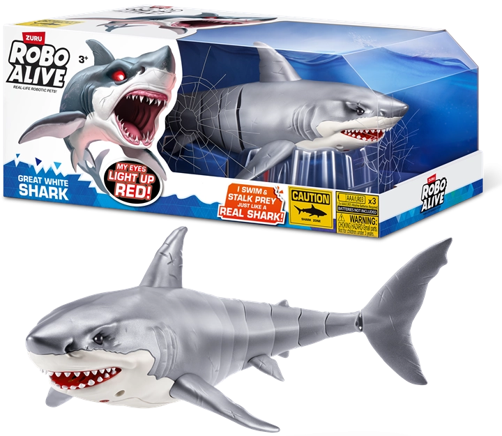 Veliki beli morski pes ROBO ALIVE znamke ZURU vsako kopanje spremeni v akcijsko pustolovščino. Po potopu v vodo se samodejno aktivira in plava kot pravi morski plenilec. Otroke navduši kombinacija tekočih, realističnih gibov in svetlečih oči, ki še okrepijo vtis lova pod gladino.