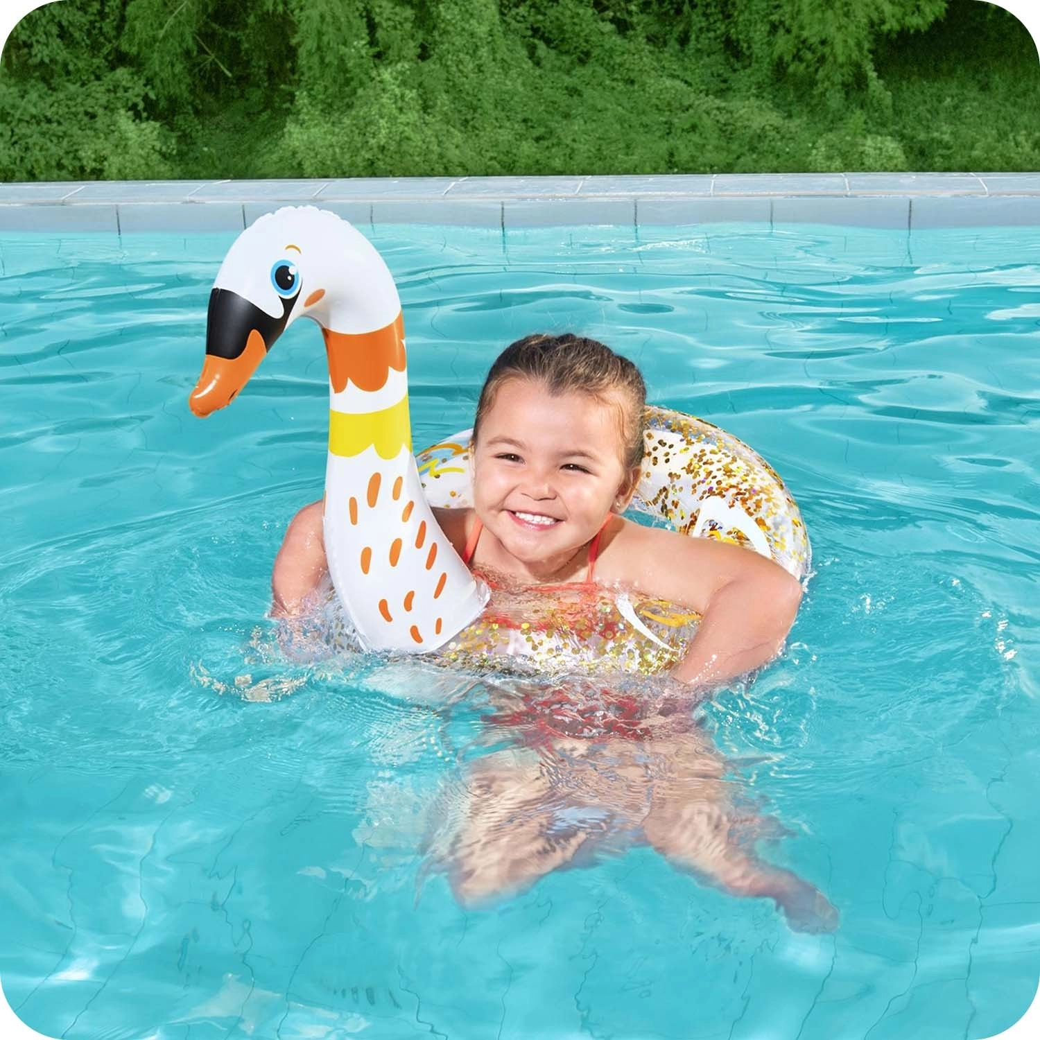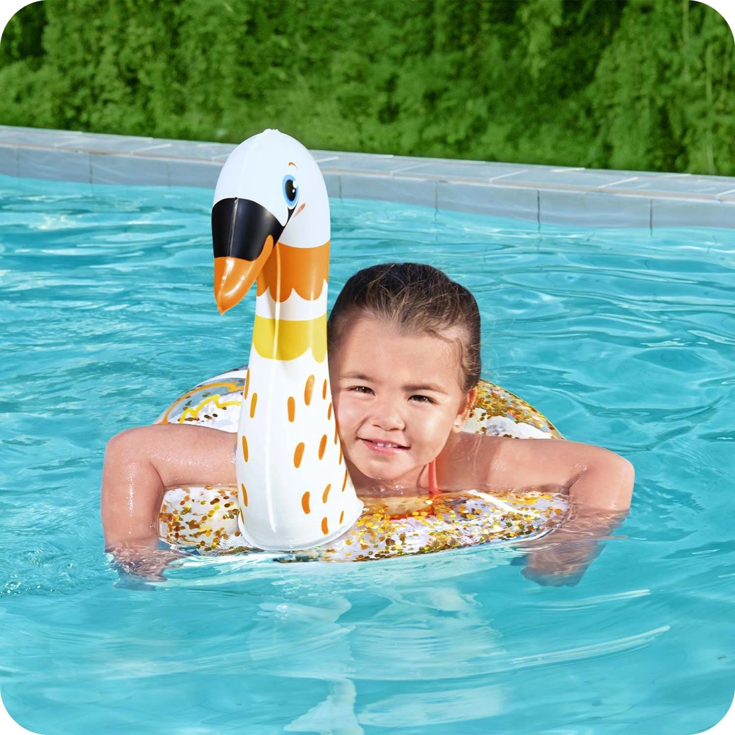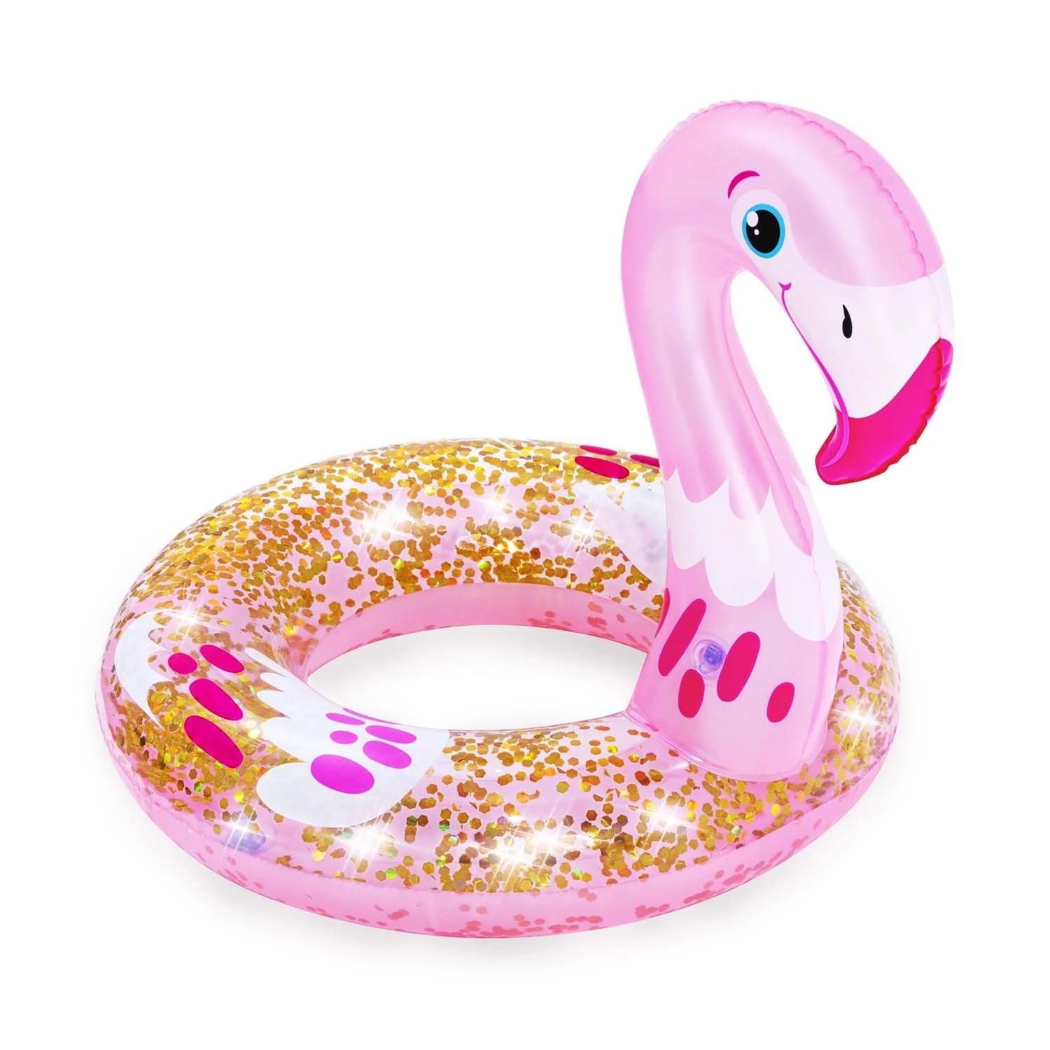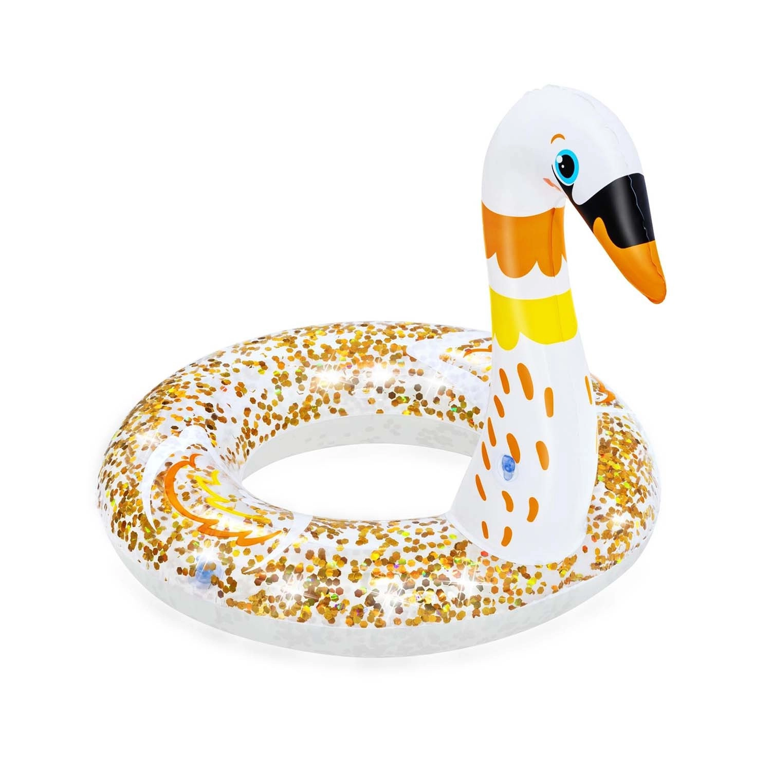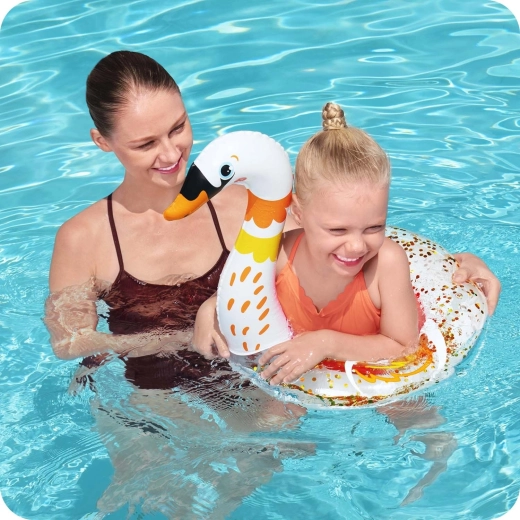 Napihljiv obroč BESTWAY spremeni vsako kopanje v zabavo. Realistična oblika laboda ali plamenca otroke takoj pritegne in jih vzpodbudi k gibanju v vodi. Prozorni deli z zlatimi bleščicami se na soncu čudovito lesketajo in obroču dodajo edinstven videz.