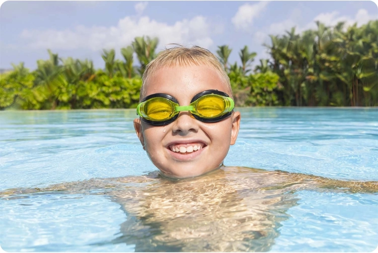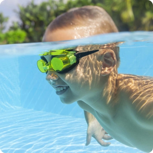 Zahvaljujoč UV odporno obdelanim lečam so primerna tudi za zunanje bazene. Hipoalergeni materiali brez lateksa zmanjšujejo tveganje draženja, medtem ko robustna konstrukcija in čist vidni kot pomagata otrokom bolje videti pod vodo in se osredotočiti na plavanje.
