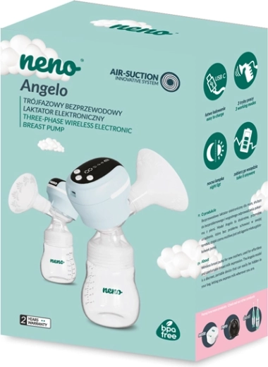 Brezžična prsna črpalka Neno Angelo ponuja 3 učinkovite faze črpanja (stimulacijsko, globinsko in mešano Let-down) z 9 stopnjami intenzivnosti v vsaki fazi. Je tiha, lahka in prenosna, ima zaslon na dotik, LED osvetlitev za nočno uporabo in zaščito pred povratnim tokom. Nežna silikonska blazinica je prijazna do kože, naprava pa je brez BPA.