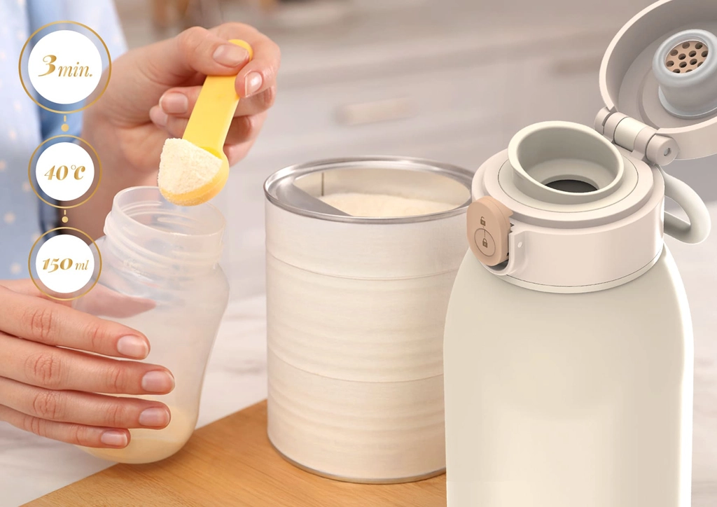 Ergonomsko ohišje z udobnim ročajem in natančna izlivna odprtina omogočata čisto in varno nalivanje brez kapljic. Velika kapaciteta 500 ml zagotavlja dovolj vroče vode za več obrokov, kar prihrani čas in živce pri skrbi za dojenčka.