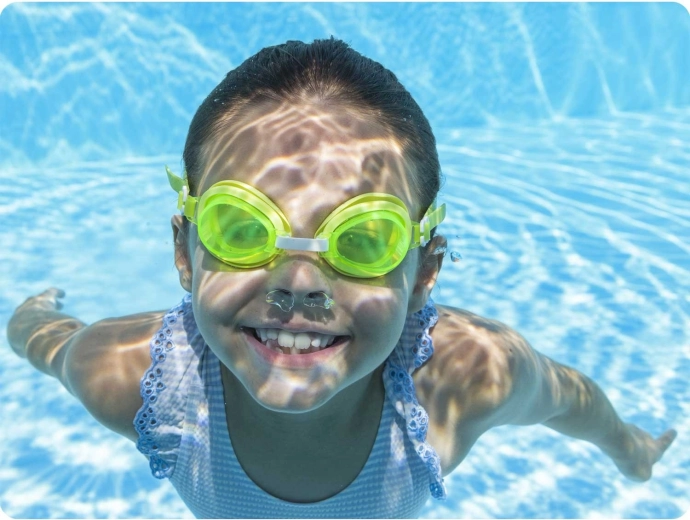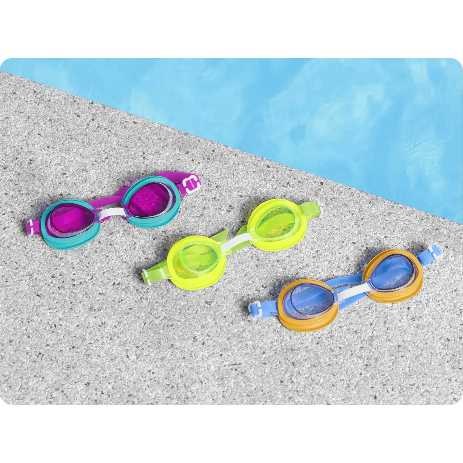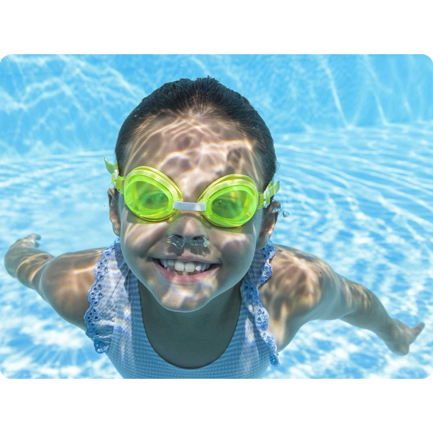 Lahka in udobna otroška plavalna očala Bestway v zeleni barvi zagotavljajo jasen pogled pod vodo ter zaščito zahvaljujoč UV-odpornim lečam. Mehek silikonski trak je popolnoma nastavljiv za varno in udobno prileganje brez lateksa – idealno za otroke od 7 let naprej.