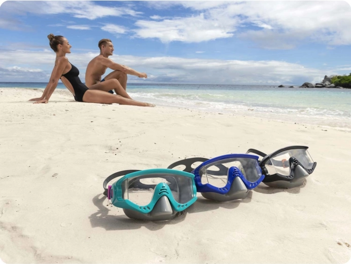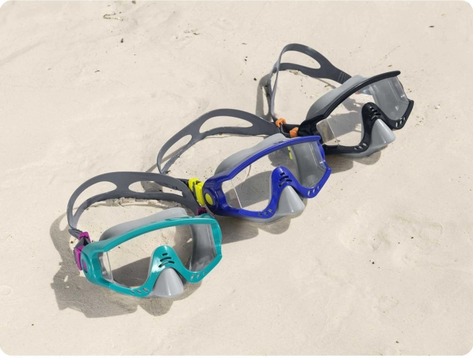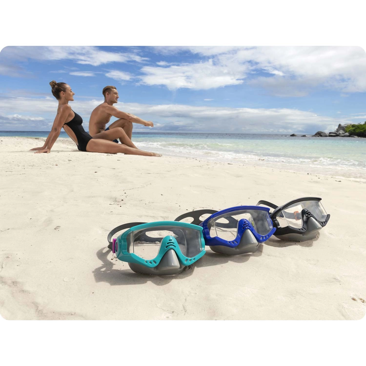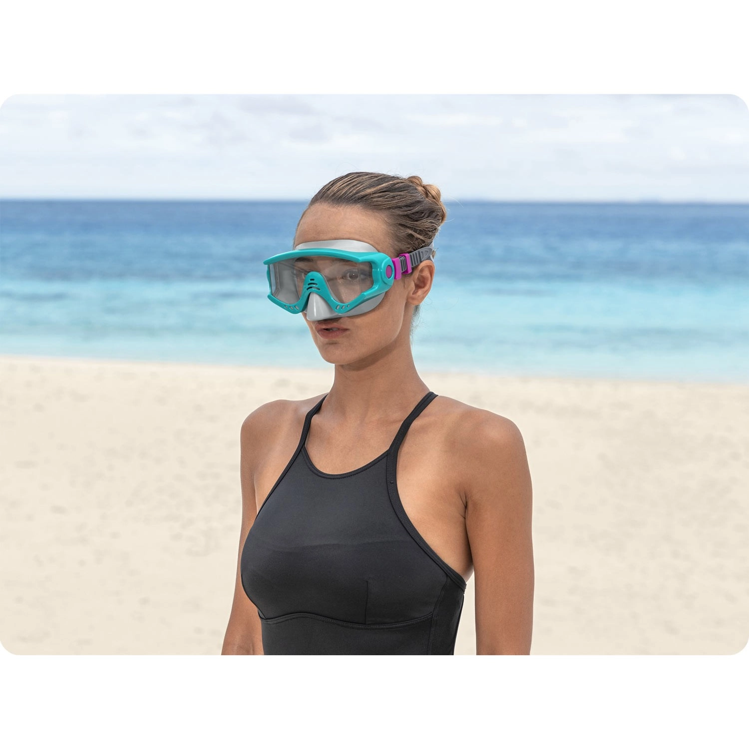 Odkrijte podvodni svet z udobjem in jasnim pogledom. Ta turkizna potapljaška maska BESTWAY ponuja široko vidno polje, polikarbonatno steklo z UV zaščito in mehek silikonski pašček za varno, tesno in udobno prileganje brez zamakanja. Univerzalna velikost in zasnova brez lateksa zagotavljata odlično izkušnjo pri plavanju in snorkljanju.