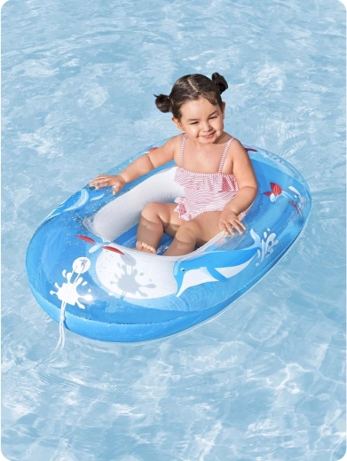Premišljene podrobnosti, kot sta napihljivo rebrasto dno za udobno sedenje in vlečna vrv za preprosto privlačenje ali vodenje po vodni gladini, povečujejo udobje in nadzor. Barvita grafika z delfini in ribicami bo navdušila vsakega otroka ter spodbudila veselje do vodnih iger.