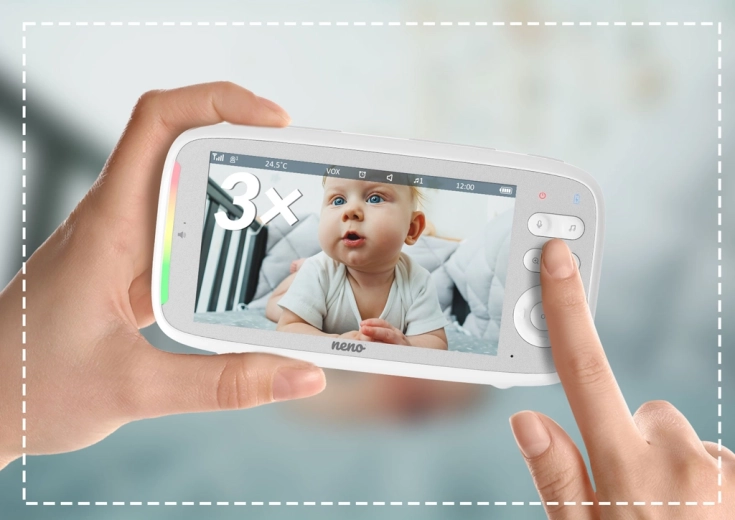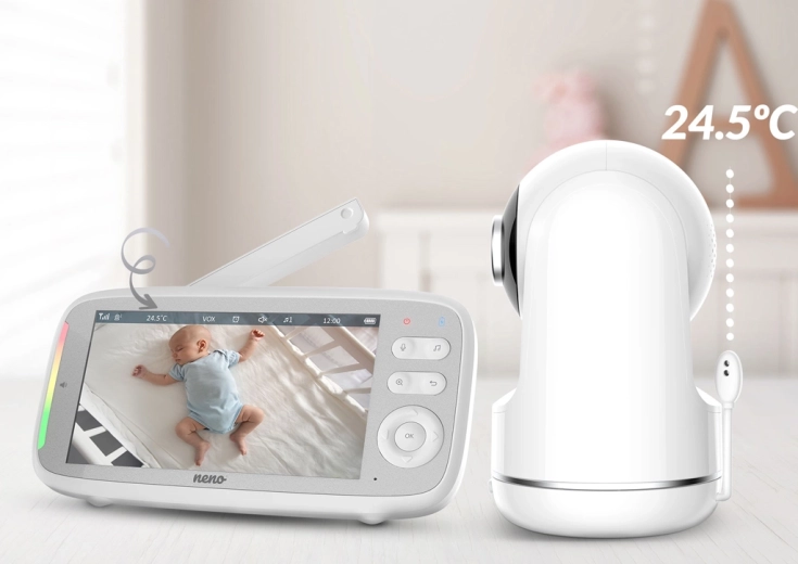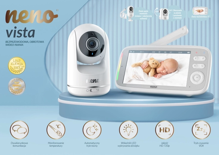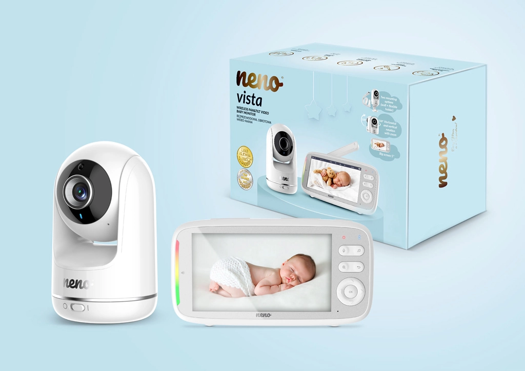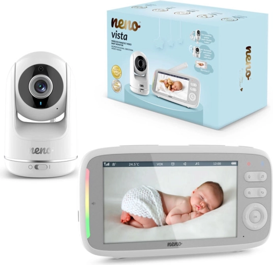 Neno Vista je zanesljiva digitalna video varuška, zasnovana za varno in udobno spremljanje otrok. Širok 5" LCD zaslon prikazuje čisto sliko v HD 720p kakovosti, samodejni nočni način z IR LED pa zagotavlja jasne podrobnosti tudi v temi. Z dvosmerno komunikacijo lahko dojenčka pomirite na daljavo, v načinu VOX pa se zaslon prižge le ob zaznanem zvoku – tako varčuje z baterijo in podaljšuje avtonomijo.