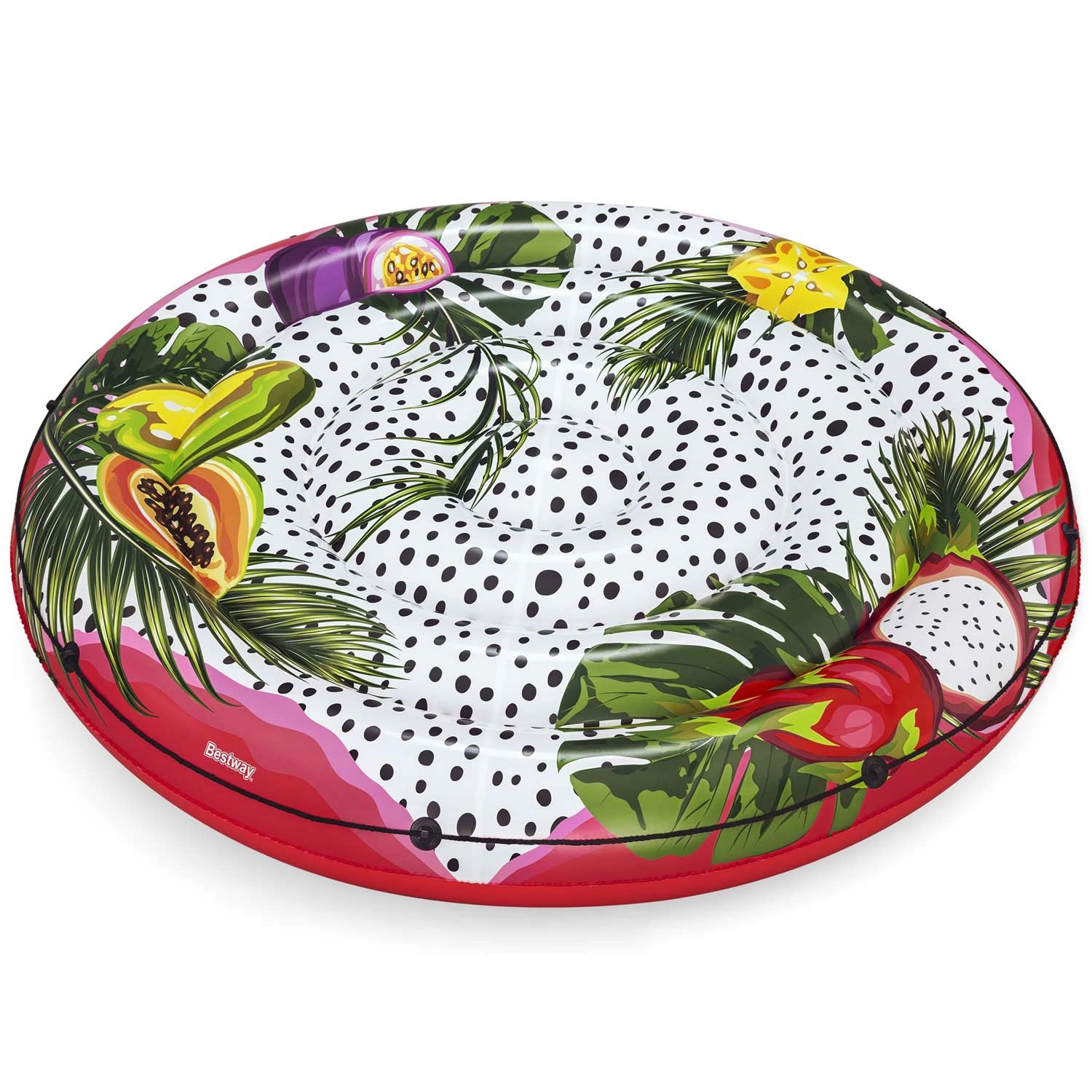 Odkrijte udobje in zabavo na vodi s plavajočo otoško blazino BESTWAY v XXL velikosti. Zahvaljujoč prostorni okrogli površini boste uživali v sprostitvi v dvoje, bodisi v bazenu, jezeru ali ob morju. Tropski potisk s sadjem in listi doda vašemu poletnemu videzu pridih in pritegne pozornost kjerkoli se pojavite.
