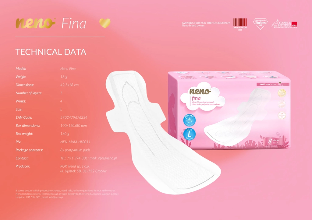 Poporodne vložke Neno Fina so razvite z mislijo na udobje, diskretnost in zanesljivost. Njihova ultra tanka konstrukcija zagotavlja neopazno zaščito, medtem ko visoka vpojnost in večja površina 425 × 185 mm nudita brezskrbnost skozi ves dan. Zračni materiali pomagajo ohranjati kožo suho in brez draženja, kar boste posebej cenili v občutljivem obdobju po porodu.