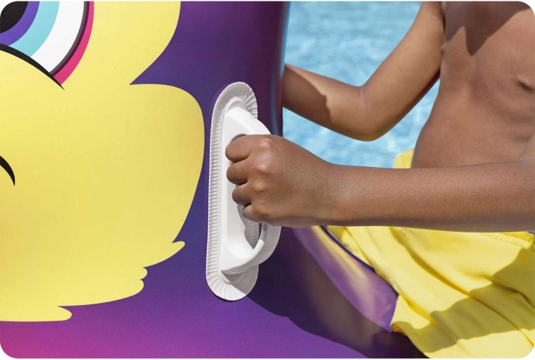 Plavalnik je izdelan iz vzdržljivega PVC, ki dobro prenese običajno uporabo. V primeru manjših poškodb uporabite priloženo krpico za popravilo. Največja nosilnost 45 kg zagotavlja dovolj vzgona za otroke, bodisi v bazenu, na morju ali jezeru.