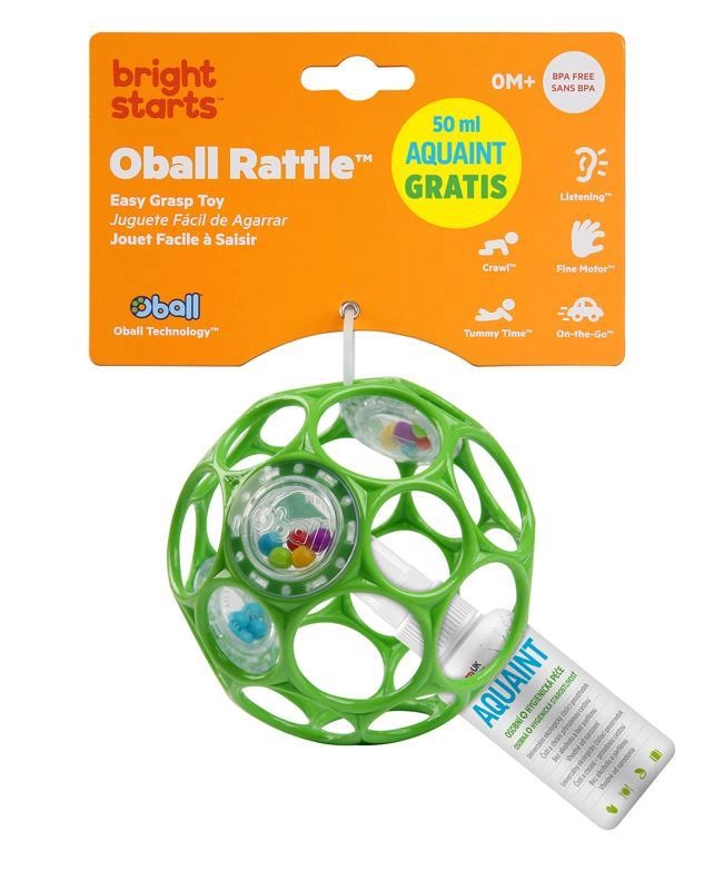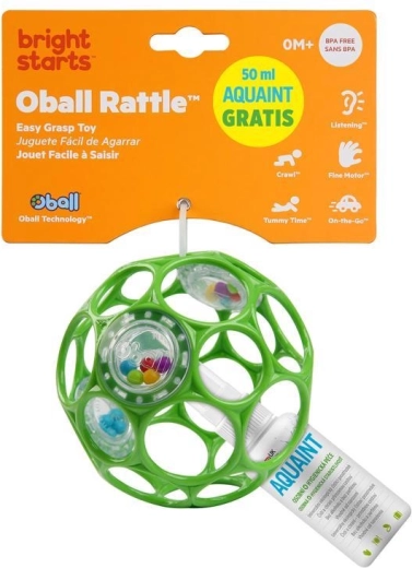 Priljubljena ropotulja OBALL s premerom 10 cm v barvi seafoam prinaša otrokom od rojstva veliko zabave in razvoj fine motorike. Zahvaljujoč 29 odprtinam jo zlahka primejo tudi najmanjše ročice, izdelana je iz lahkega in prožnega materiala, v notranjosti pa ima 3 jasne ropotulje z barvnimi kroglicami za spodbudne zvoke. Del pakiranja je tudi AQUAINT 50 ml – 100% naravna čistilna voda brez alkohola in dišav, primerna od rojstva in idealna za potovanja ter vsakodnevno higieno.