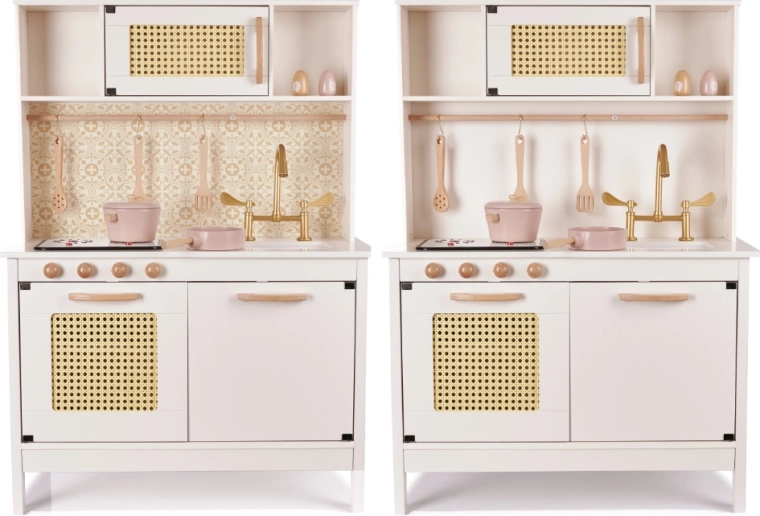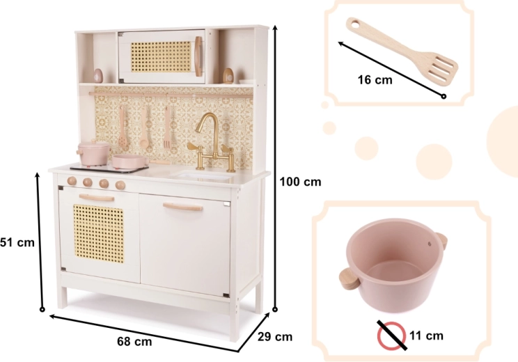 Stilna lesena kuhinjica v retro BOHO dizajnu prinaša otrokom ure ustvarjalne igre. Ponuja svetleče in zvočne gorilnike, globok umivalnik z zlatim pipo, ratanasto polnilo vratc in bogate lesene dodatke. Varna, natančno izdelana in odlično usklajena z interierji v slogu Scandi in Boho.