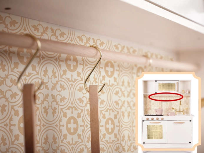 Podprite domišljijo in fino motoriko svojih otrok s kuhinjico, ki izgleda kot prava. Vrtljiva lesena gumba, odpirajoča se vratca, letvica s kljukicami in odstranljiv panel kuhalne plošče z učinki svetlobe in zvoka spremenijo kuhanje v zabavo in učenje brez tveganja. Dvostransko ozadje (gladko kremno/ornamentalna tapeta) omogoča, da videz kuhinjice preprosto prilagodite razpoloženju.