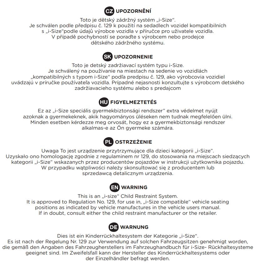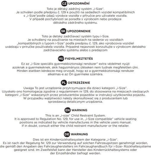 - Varnost i-Size: homologacija po ECE R129 za otroke 100–150 cm.