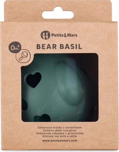 Prisrčni medvedek Bear Basil združuje ropotuljico in grizalo v enem. Izdelan iz 100 % silikona za stik z živili brez BPA, je mehak, lahek in varen za dojenčke že od rojstva. Ergonomska oblika z odprtinami omogoča preprost oprijem tudi majhnim ročicam, nežno ropotanje spodbuja sluh, raznolike teksture pa podpirajo senzorični razvoj.