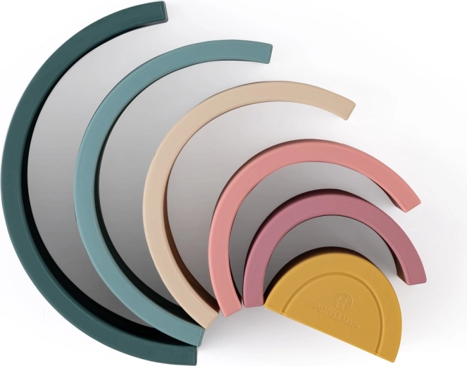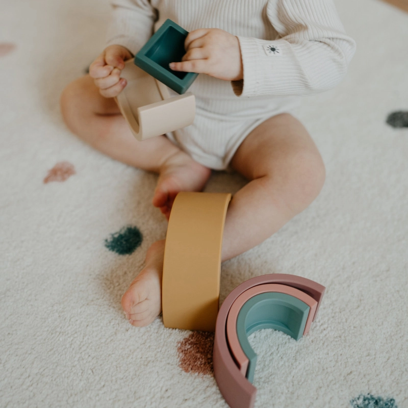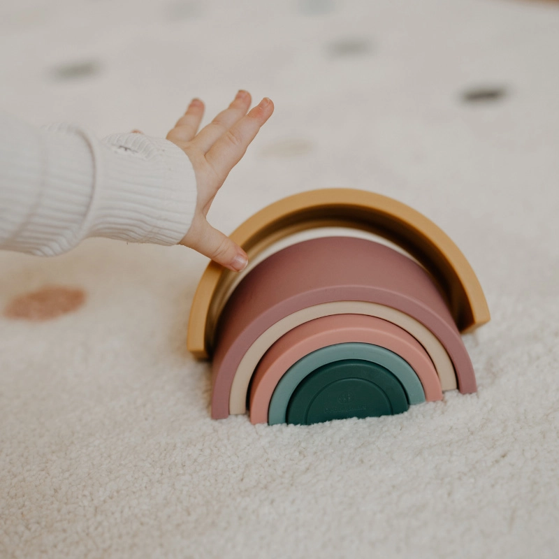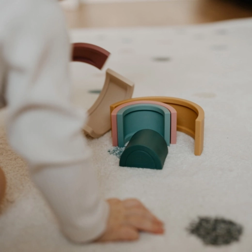 Silikonska zložljiva mavrica Misty Green ponuja otrokom odprto igro brez pravil. Loke lahko zlagajo, obračajo, uravnotežajo ali uporabljajo kot preproste mostove in tunele. Tako otroci na nevsiljiv način urijo prostorsko predstavljivost, osredotočenost in natančnost gibov – ob tem pa se odlično zabavajo.