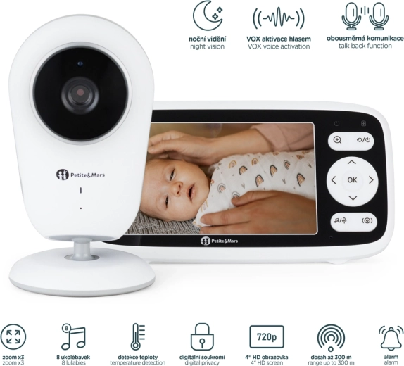 VOX aktivacija varčuje z baterijo, dvosmerni zvok pomiri dojenčka z vašim glasom, merjenje temperature skrbi za udobje, 8 uspavank z alarmom pa pomaga pri rutini.