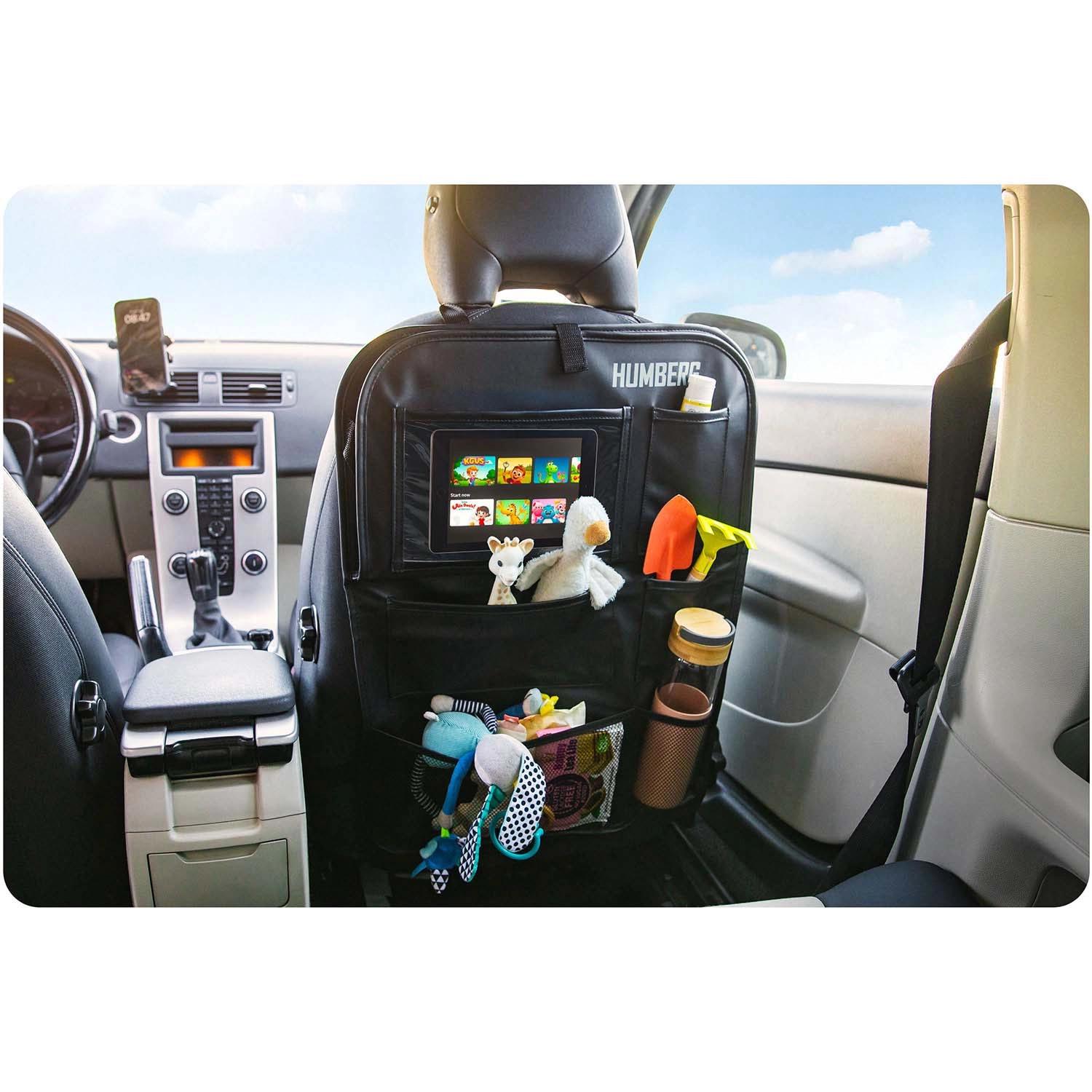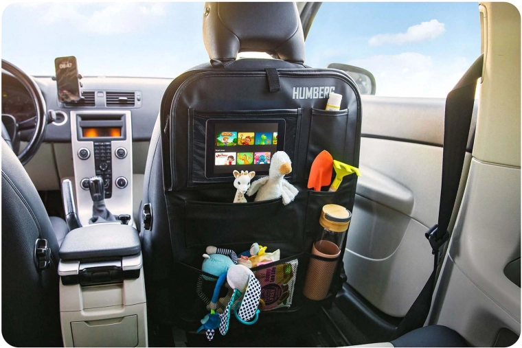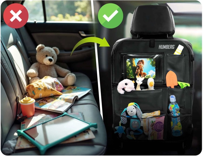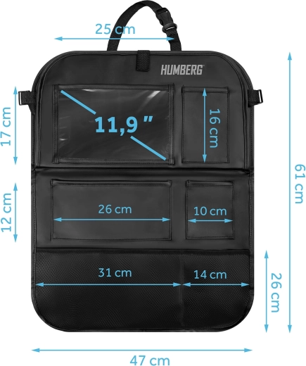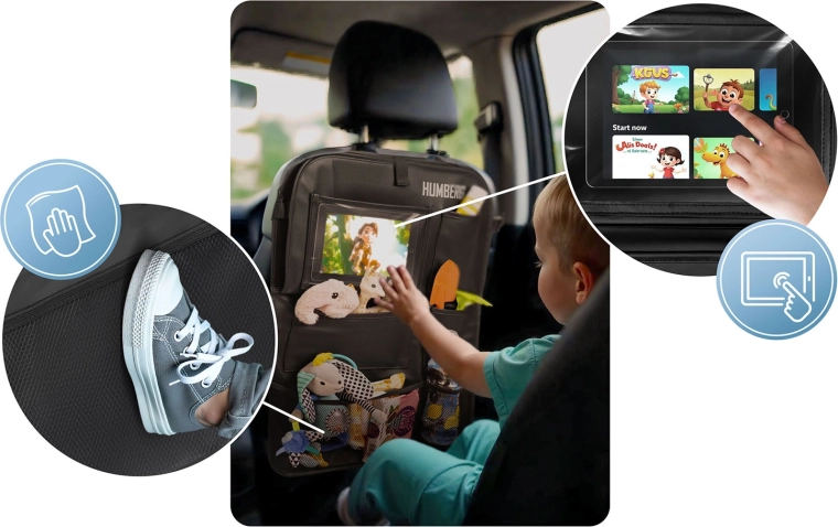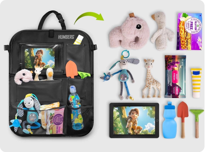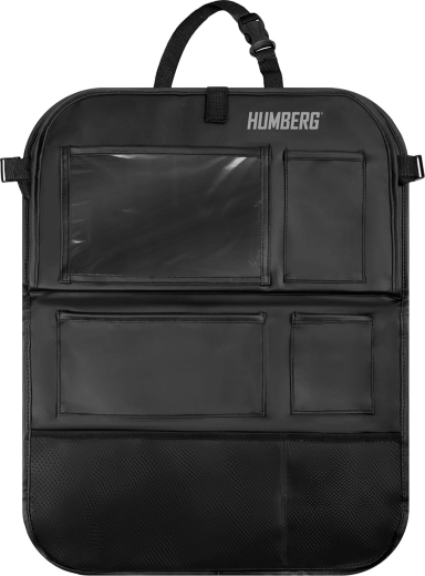 Ohranite avto urejen in potovanja z otroki mirnejša s praktičnim organizatorjem HUMBERG za hrbtno stran sedeža. Ponuja prozoren žep za tablico z odzivno folijo na dotik, zložljivo mizico za malico ali risanje, držalo za steklenico ter več prostorskih žepov za igrače in drobnarije. Enostavna montaža, material, ki se zlahka čisti in zaščita oblazinjenja pred umazanijo od čevljev.
