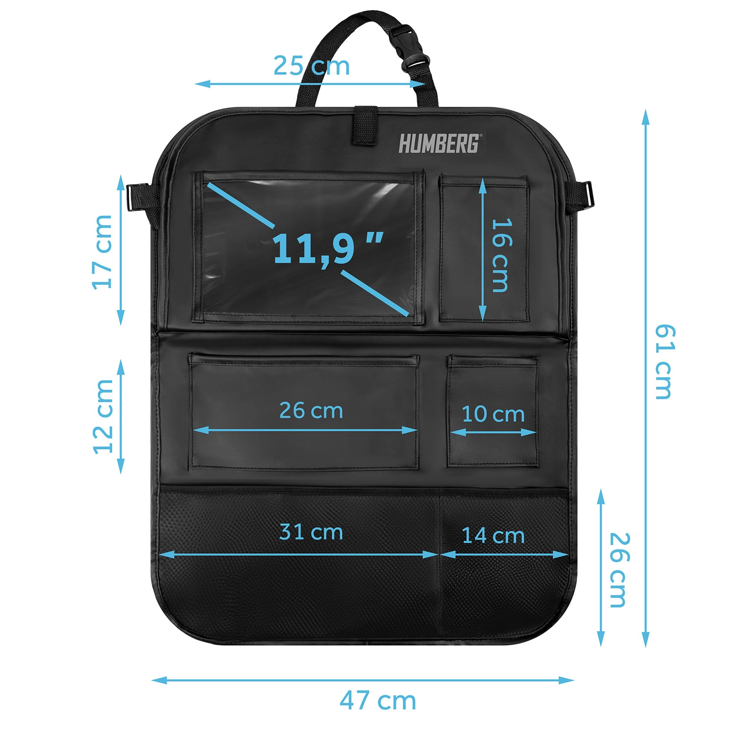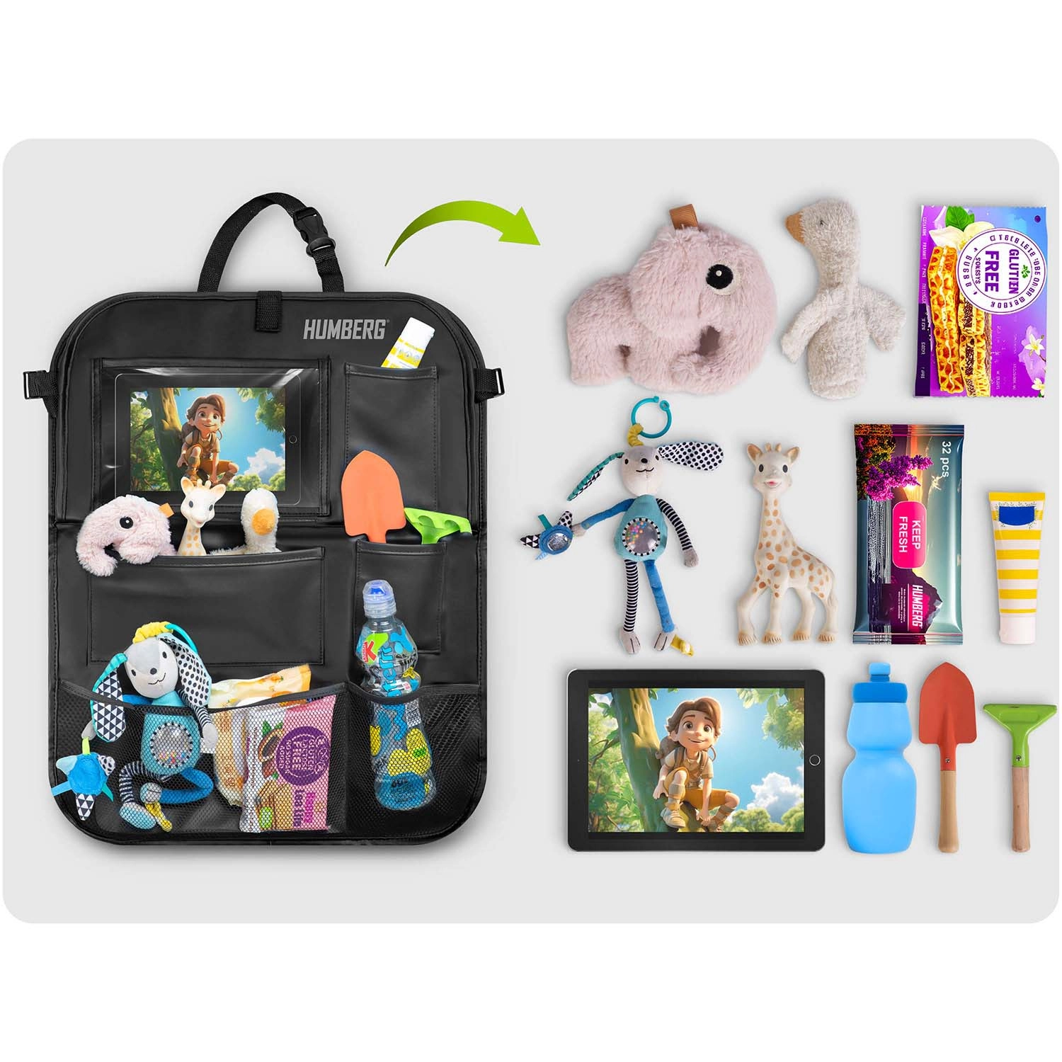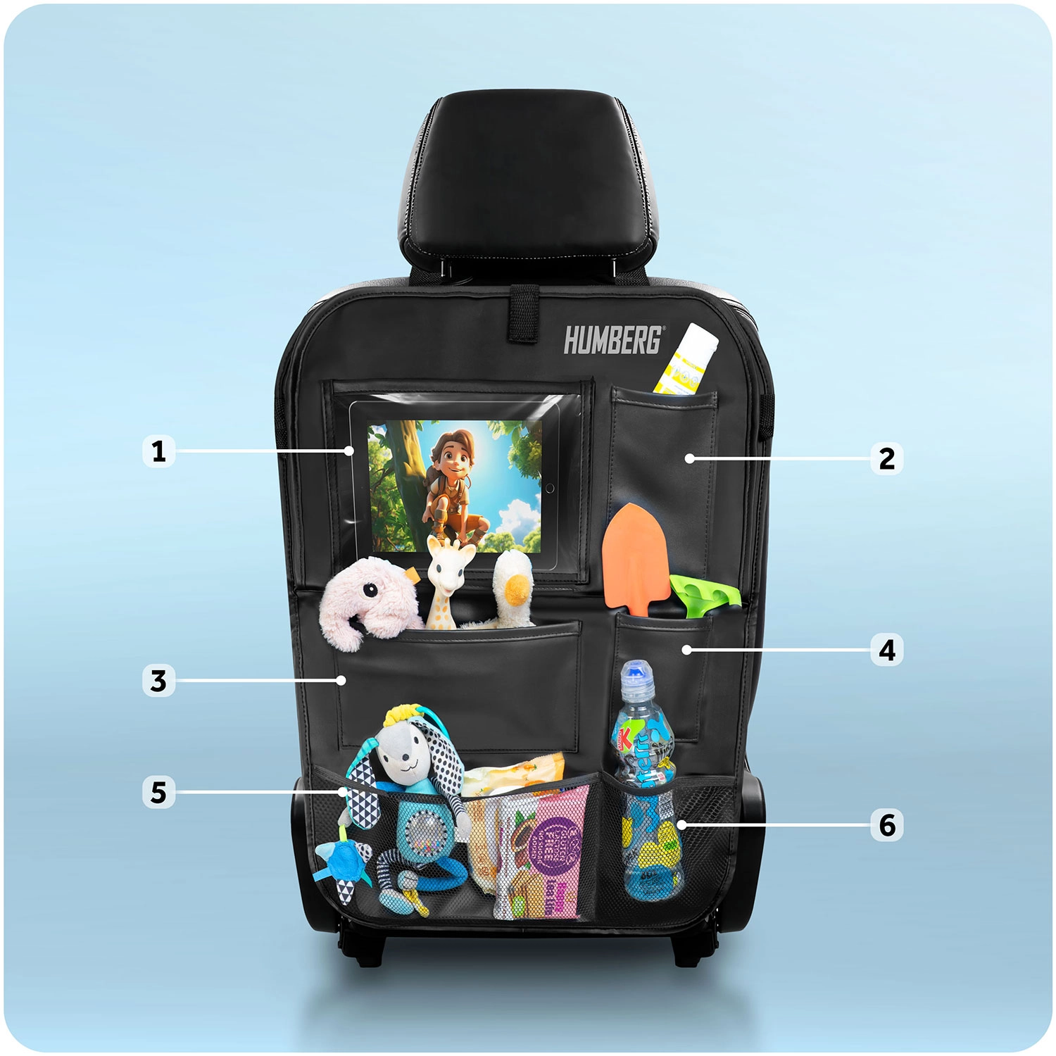 Ohranite avto urejen in potovanja z otroki mirnejša s praktičnim organizatorjem HUMBERG za hrbtno stran sedeža. Ponuja prozoren žep za tablico z odzivno folijo na dotik, zložljivo mizico za malico ali risanje, držalo za steklenico ter več prostorskih žepov za igrače in drobnarije. Enostavna montaža, material, ki se zlahka čisti in zaščita oblazinjenja pred umazanijo od čevljev.