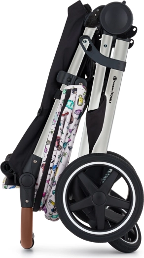 Stilski športni voziček Petite&Mars Royal 3 Silver Limited 100 Tattoo v izdaji zgolj 100 kosov združuje elegantno srebrno ogrodje, polna gumirana kolesa brez tveganja za predrtje in panoramsko prezračevanje z treh strani za največje udobje otroka. Ponuja zlaganje z eno roko, magnetno zaponko, nastavljiv ročaj iz eko usnja in ekstra dolgo strešico s SPF 50. Del kompleta sta strešica in obojestranski vložek z vzorcem Tattoo, dežna odeja za noge in previjalna torba.