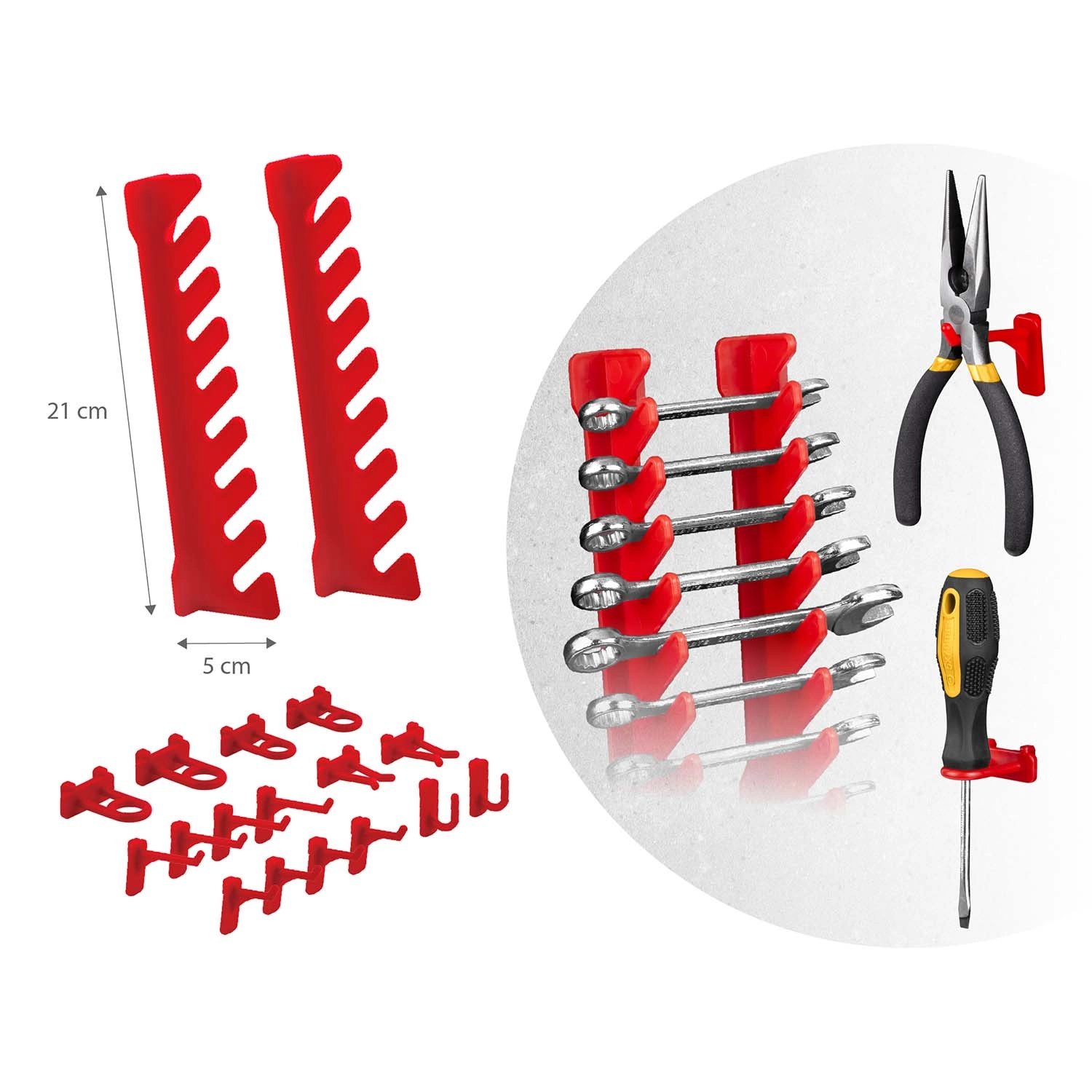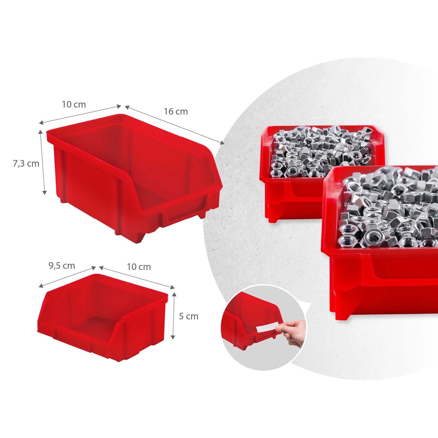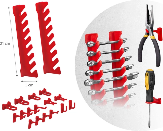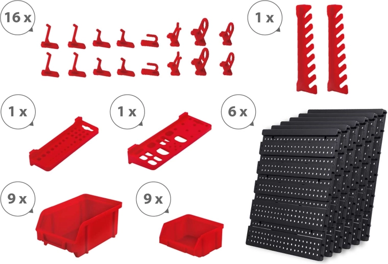 18 posodic v dveh velikostih, dve odlagalni polici ter komplet kljuk in držal zagotavljajo pregledno razvrščanje pritrdilnega materiala in varno shranjevanje orodja.
