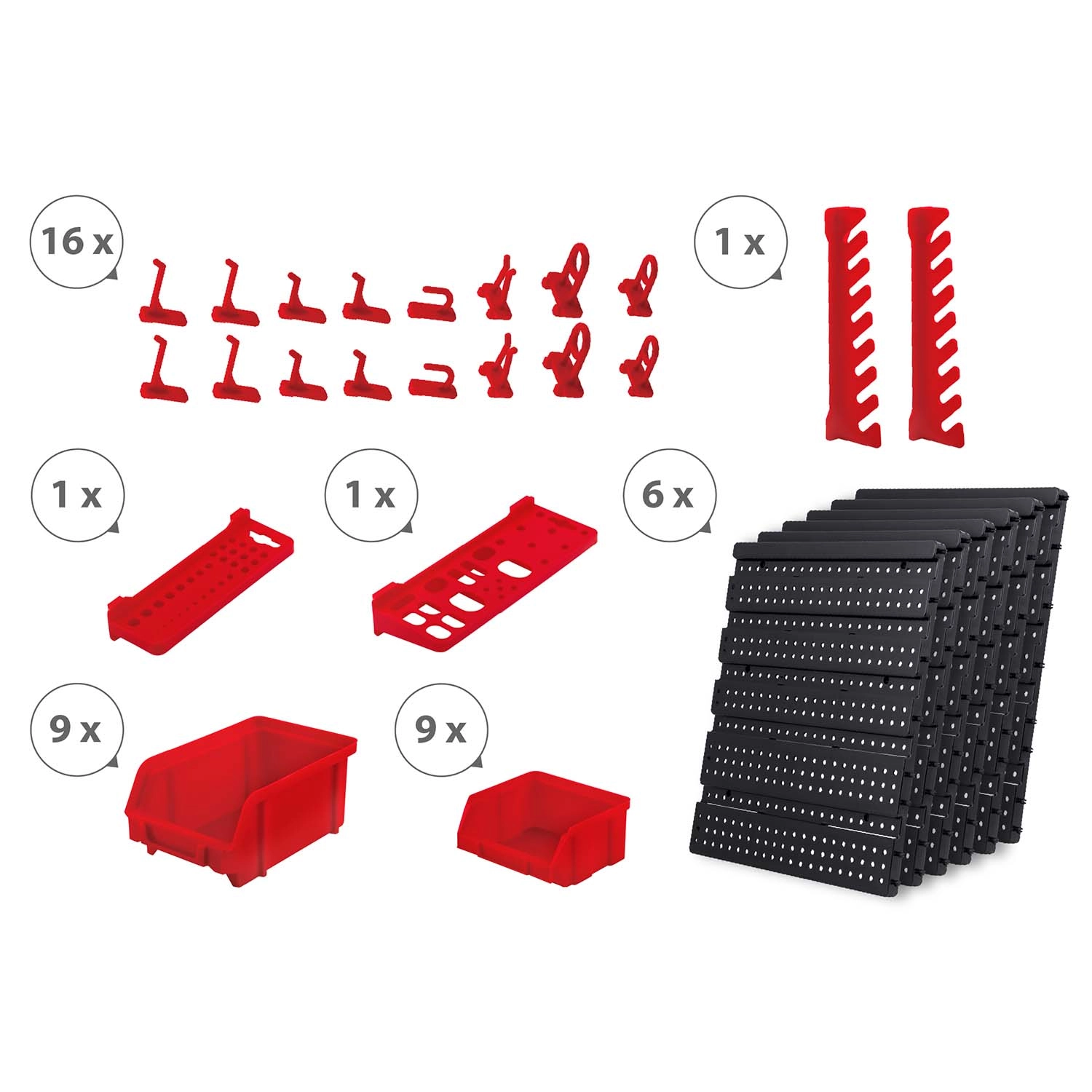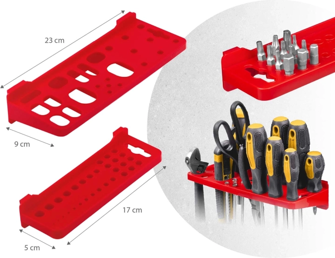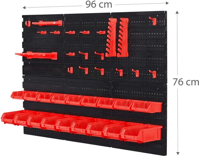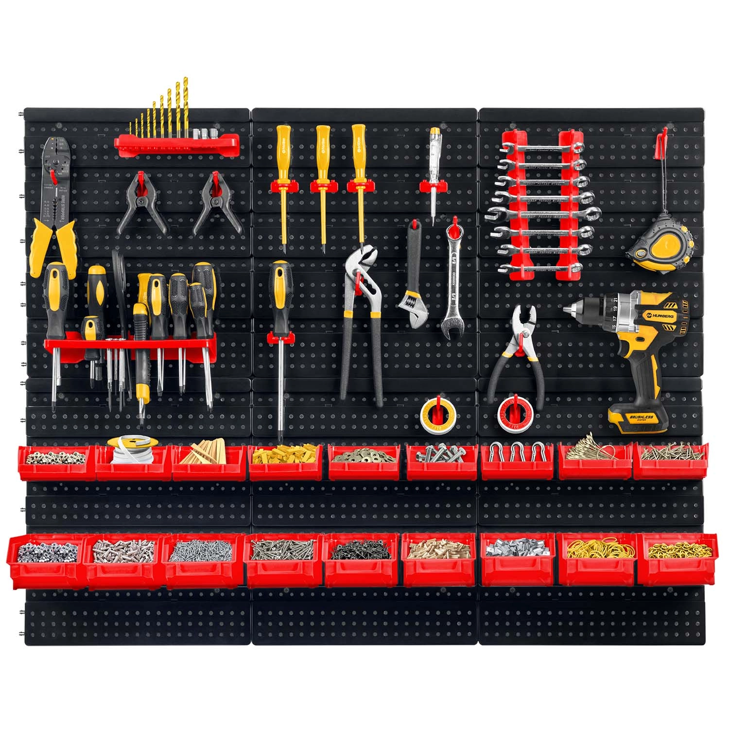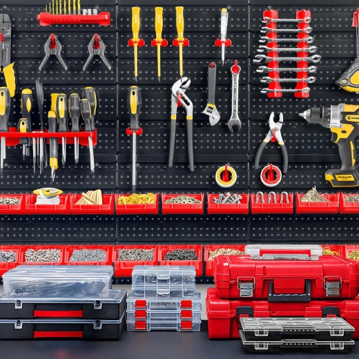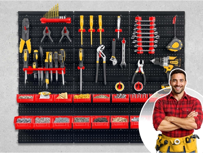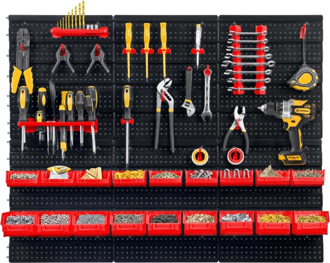 Kompletni stenski organizator HUMBERG je nepogrešljiv pomočnik za vsak servis in domačo garažo. Zahvaljujoč modularnemu sistemu perforiranih panelov si lahko postavitev preprosto prilagodite svojim potrebam. Čvrste kljuke, držala in police bodo držale izvijače, klešče in ključe, medtem ko različne velikosti posodic pregledno razvrstijo pritrdilni material.