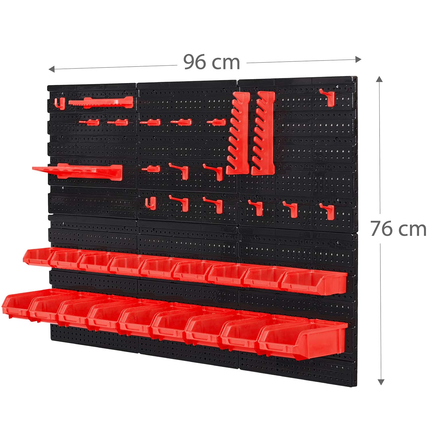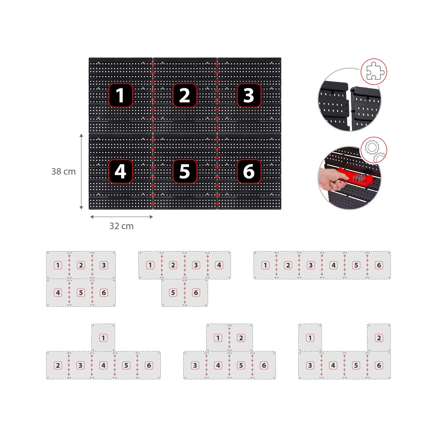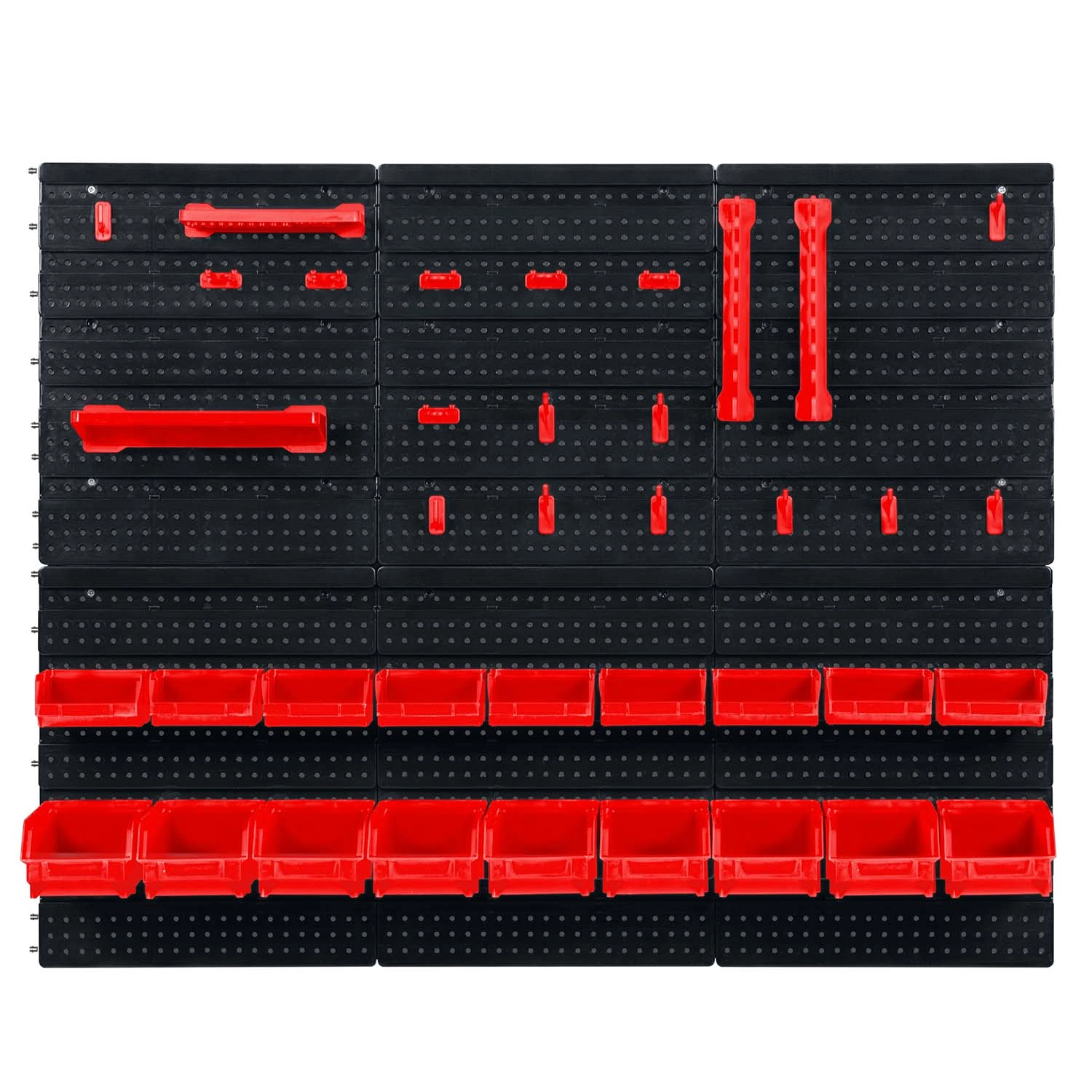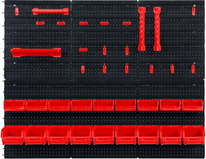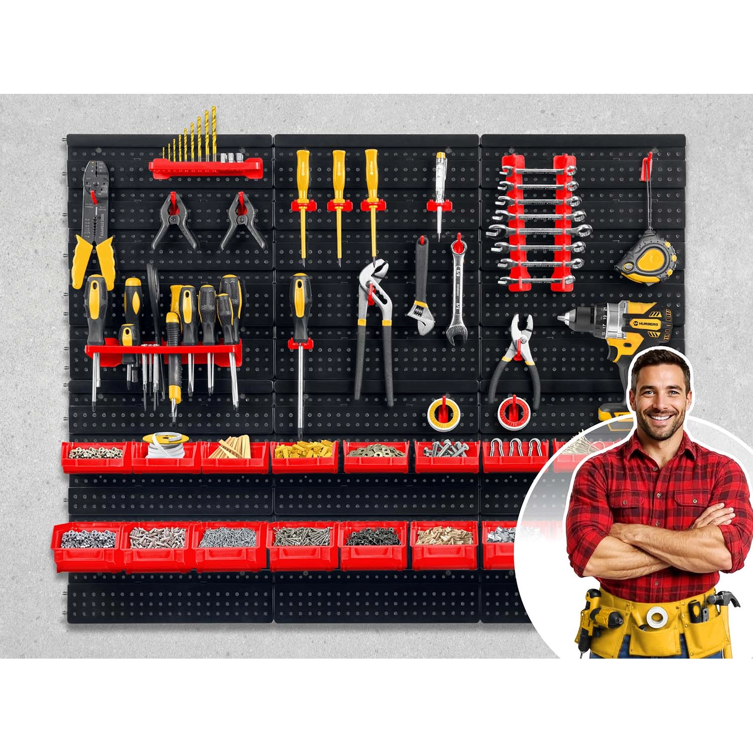 Kompletni stenski organizator HUMBERG je nepogrešljiv pomočnik za vsak servis in domačo garažo. Zahvaljujoč modularnemu sistemu perforiranih panelov si lahko postavitev preprosto prilagodite svojim potrebam. Čvrste kljuke, držala in police bodo držale izvijače, klešče in ključe, medtem ko različne velikosti posodic pregledno razvrstijo pritrdilni material.