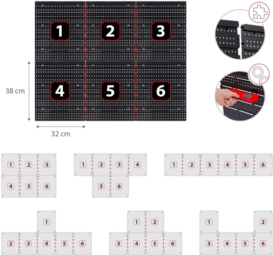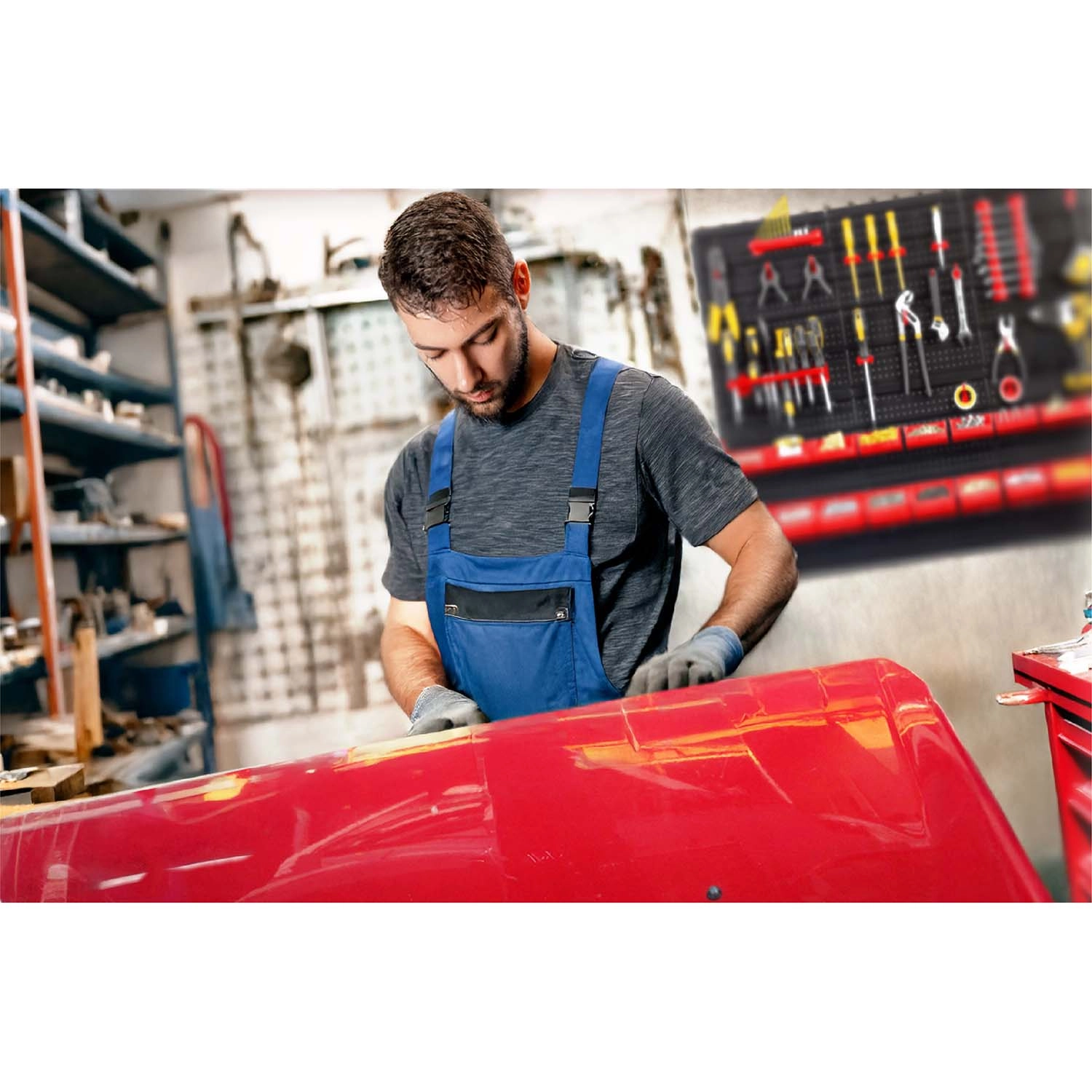 Ohranite popoln red v svoji delavnici s stensko tablo za orodje HUMBERG z merami 96 × 76 cm. Modularne plošče, do 43 praktičnih dodatkov (posodice, kljuke, police in držala) ter čvrste perforirane plošče zagotavljajo pregledno shranjevanje vijakov, bitov in ročnega orodja. Enostavna montaža, prosta razporeditev dodatkov in odporni materiali zagotavljajo dolgo življenjsko dobo doma in v profesionalnem servisu.