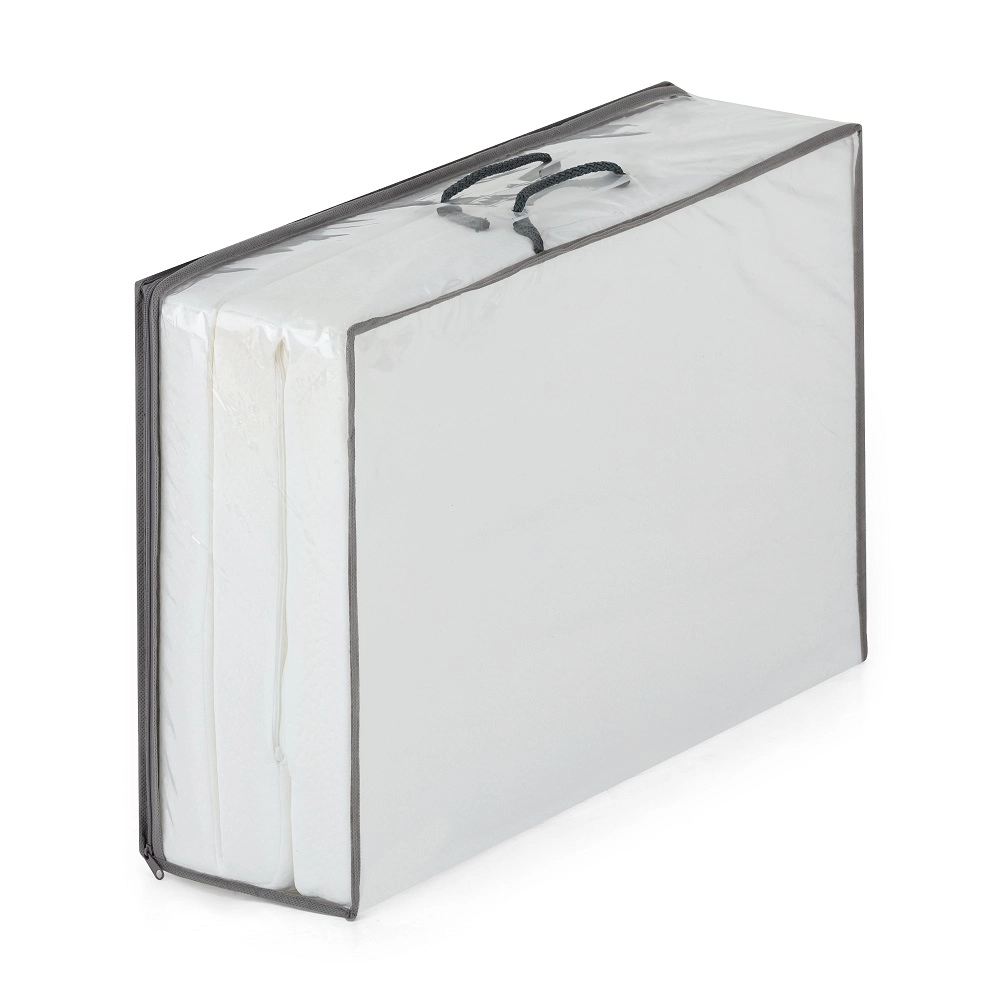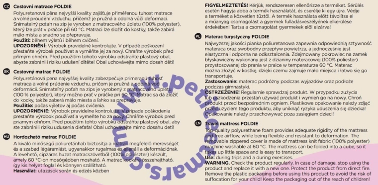 Praktična prevleka z zadrgo iz trpežne pletene tkanine za vzmetnice se zlahka sname in opere pri 60 °C. Vzmetnica se hitro zloži v kocko, zato ne zavzema veliko prostora ne v avtomobilu ne doma. Del pakiranja je tudi torba z ročajem za enostavno prenašanje in shranjevanje. Primerna za potovalne posteljice in kot podloga za vadbo.