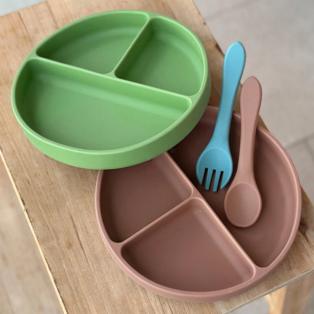 Celoten komplet je izdelan iz 100% silikona za stik z živili, brez BPA, odpornega na tople in hladne jedi. Enostavno vzdrževanje in možnost pranja v pomivalnem stroju ga naredita idealno izbiro za vsakodnevno uporabo doma in na poti. Kolekcija TAKE&MATCH omogoča barvno usklajevanje pribora z skledicami, krožniki in drugim dodatkom.