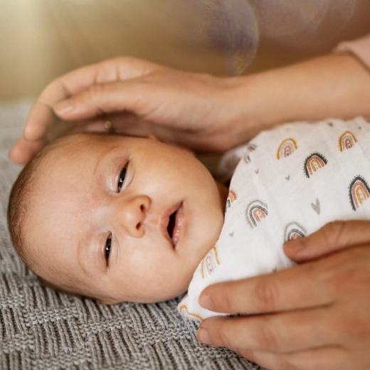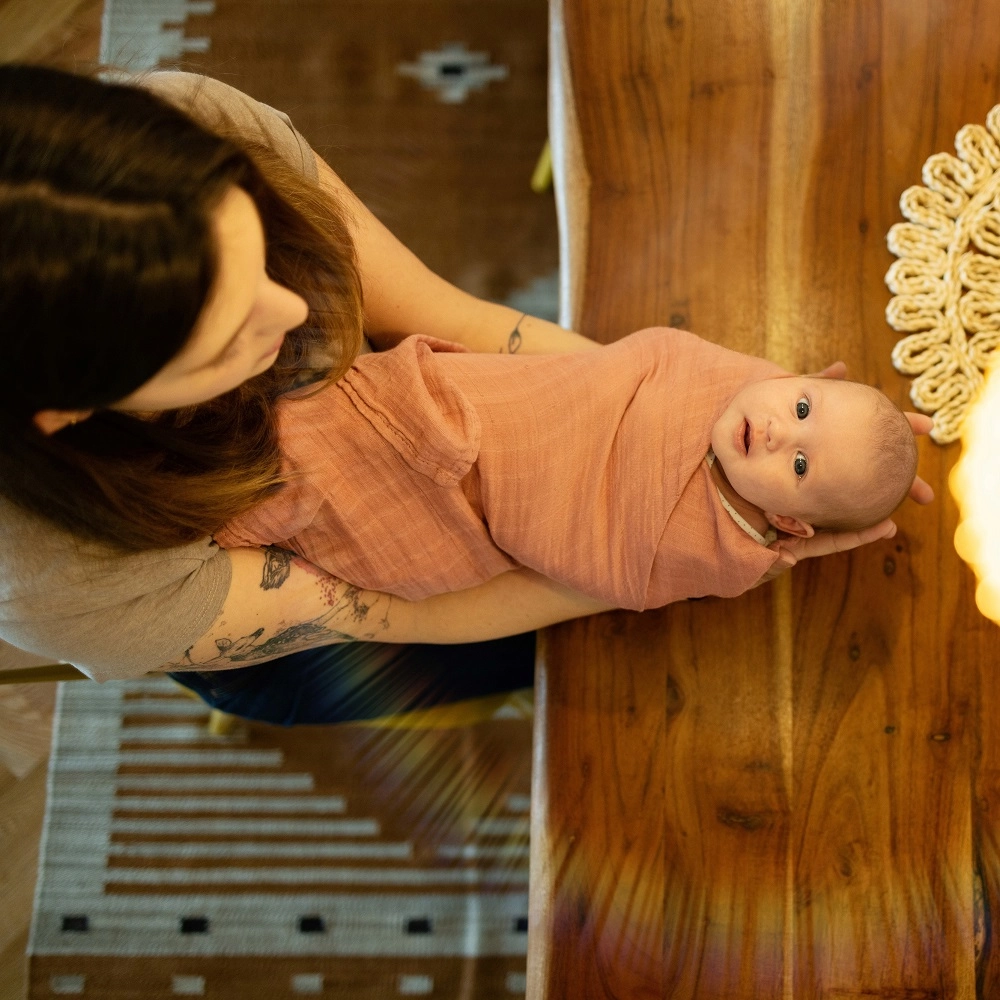 Format 120 × 120 cm olajša varno in udobno povijanje ter drugo uporabo – od odejice do senčila za voziček ali lahke odeje za avtosedež.